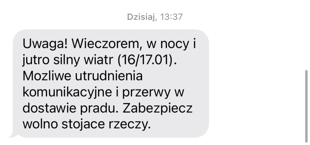 Kolejny alert RCB został rozesłany do mieszkańców powiatu lęborskiego. Wieczorem, w nocy i jutro mamy spodziewać się silnego wiatru (16/17.01). Mozliwe utrudnienia komunikacyjne i przerwy w dostawie pradu. Mieszkańcy proszeni są o zabezpieczenie wolno stojących rzeczy poza domem.