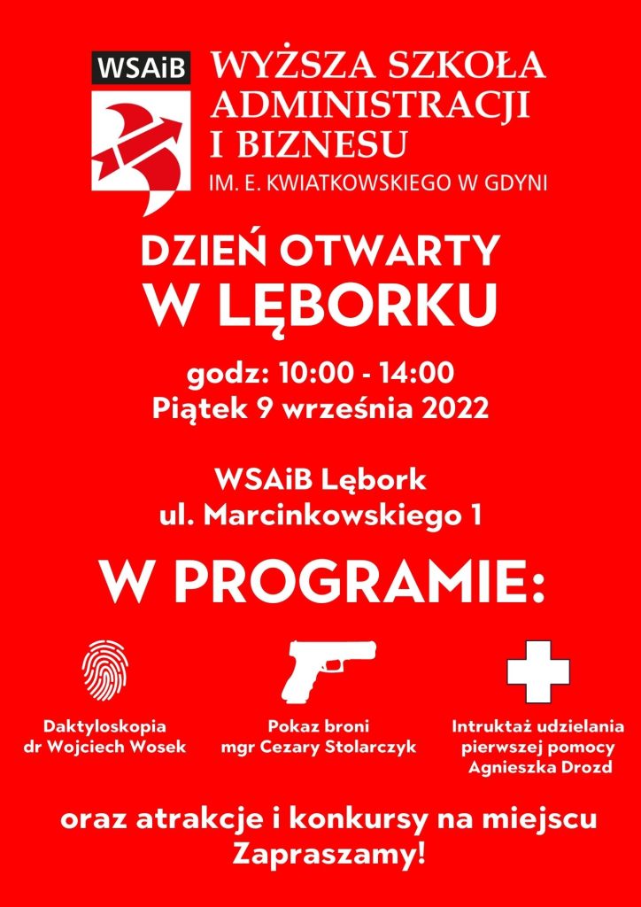 Nie skąd… Chciałabym w tym miejscu serdecznie zaprosić mieszkańców Lęborka i okolic na Dzień Otwarty Uczelni. W dn. 9 września br w godz. 10:00 – 14:00 zaprezentujemy naszą ofertę w siedzibie Filii przy ulicy Marcinkowskiego 1, czyli w budynku „Mechanika”. W tym dniu otwarty będzie również Dziekanat, od 16:00 do 18:00.