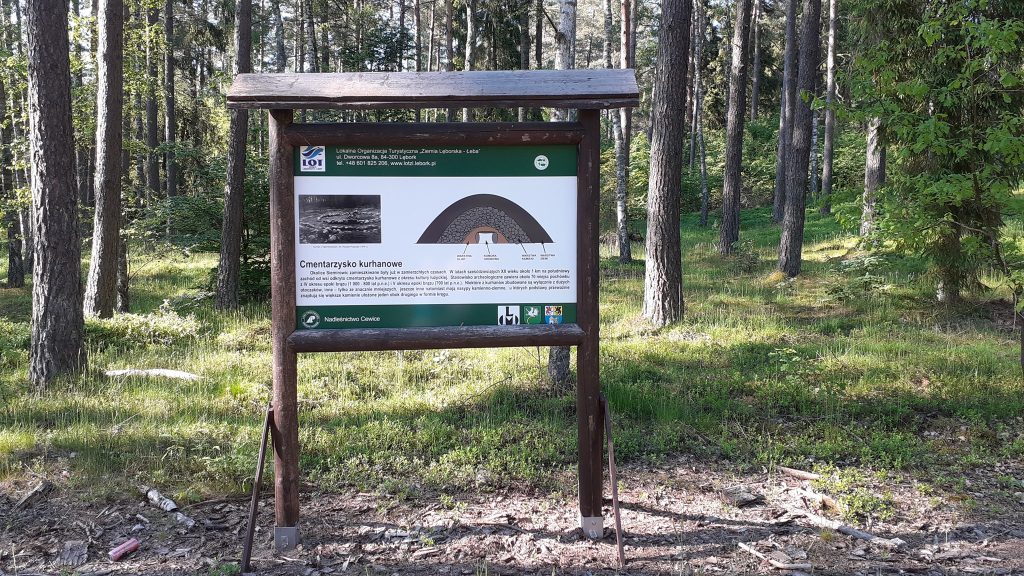 Cmentarzysko oznaczone jest tablicą informacyjną wykonaną niedawno z inicjatywy Nadleśnictwa Cewice oraz Lokalnej Organizacji Turystycznej “Ziemia Lęborska – Łeba”. W opisie zamieszczonym na tablicy zawarto szczegóły budowy grobów oraz pokrótce historię prowadzonych na obszarze cmentarzyska prac archeologicznych. Tekst wzbogacony został o rysunek przekroju poprzecznego przykładowego kurhanu, a także cenną fotografię z 1976 roku, autorstwa Ryszarda Kapusty, wieloletniego badacza dawnych miejsc pochówku na terenie Pomorza, członka Stowarzyszenia Badań Kamiennych Kręgów z Gdyni.