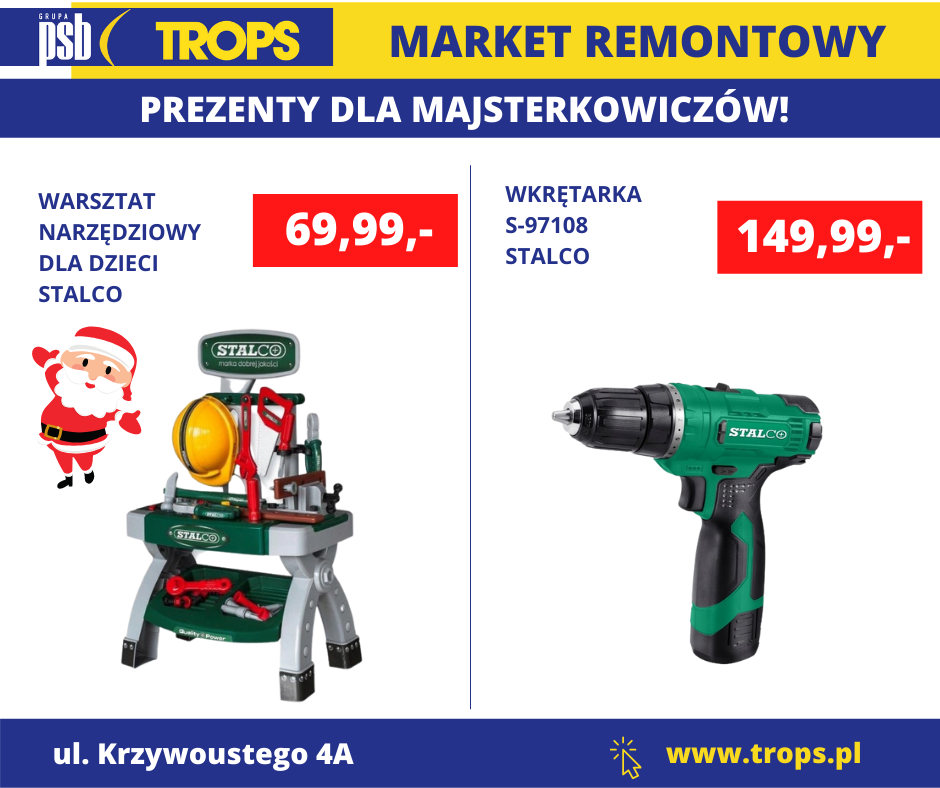 W najnowszej gazetce znajdziecie propozycje wyjątkowych i praktycznych prezentów zarówno dla małych jak i dużych majsterkowiczów. W ofercie marketu TROPS pojawiły się również lampki choinkowe w atrakcyjnych cenach, szereg artykułów do sprzątania, w tym produkty renomowanej firmy Vileda. Jeżeli macie w planach remont łazienki, również znajdziecie coś dla siebie. Sprawdźcie ceny wszystkich przecenionych produktów w naszej najnowszej gazetce.