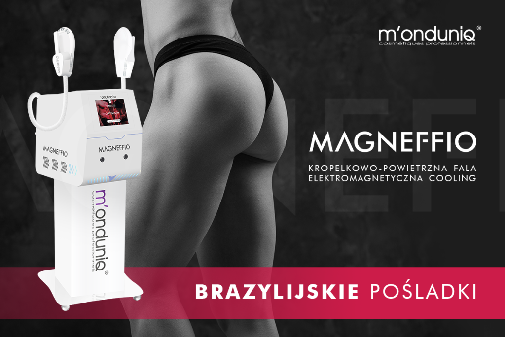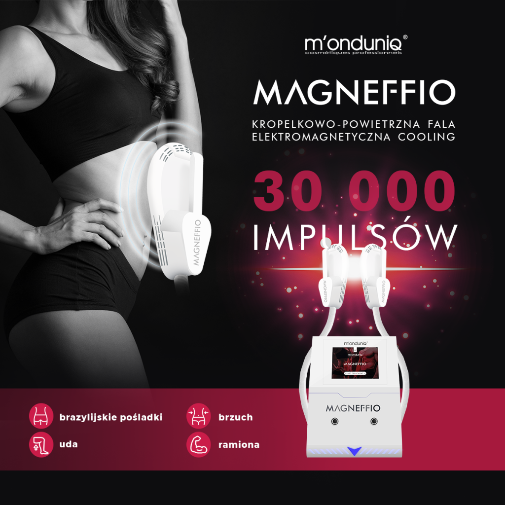 Magneffio „Ty odpoczywasz, a Magneffio ćwiczy za Ciebie”, czyli sylwetka wyrzeźbiona bez siłowni. Jest to urządzenie do budowania mięśni oraz redukcji tkanki tłuszczowej przy pomocy fali elektromagnetycznej. Podczas 30 minutowego zabiegu, mięśnie generują do 30000 skurczy, czyli wykonują pracę, której nie jesteśmy w stanie zrealizować podczas regularnego treningu. Urządzenia tego typu były wytworzone na potrzeby Hollywood, żeby aktorzy w krótkim czasie uzyskali muskularne ciało. Zabiegi są w 100% nieinwazyjne, a efekt jest widoczny bezpośrednio po zabiegu. Zabiegi można wykonywać na brzuchu, pośladkach, udach i ramionach w celach estetycznych, ale również w celach fizjoterapeutycznych – wzmocnienie mięśni po urazach, leczenie bólu w przypadku rwy kulszowej czy ostrogi piętowej, i co bardzo ważne, mamy do dyspozycji program do wzmacniania mięśni kegla, między innymi w celu leczenia problematycznego nietrzymania moczu. Zalecana seria zabiegów to 10, cena jednego 30- minutowego zabiegu to 160 zł. Dziesiąty zabieg jest gratis, a w przypadku płatności za całość z góry, dostają Państwo w prezencie dodatkowy 11-ty zabieg. Zabiegi wykonuje się 2 razy w tygodniu.