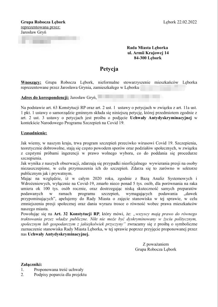 W petycji skierowanej do Rady Miejskiej Lęborka wnioskodawcy swój wniosek argumentują m.in. tak: „Jak wiemy, w naszym kraju, trwa program szczepień przeciwko wirusowi Covid 19. Sczepienia, teoretycznie dobrowolne, stają się często powodem sporów oraz podziałów społecznych, w związku z częstymi próbami ingerencji w prawo wolnego wyboru, co do poddania się procedurze szczepienia. Jak wynika z naszych obserwacji, zdarzają się przypadki nieoficjalnego wywierania presji na osoby niezaszczepione, w celu przymuszenia ich do szczepień. Zdarza się to zarówno w sektorze publicznym i prywatnym. Powołując się na Art. 32 Konstytucji RP, który mówi, że: „Wszyscy maja prawo do równego traktowania przez władze publiczne. Nikt nie może być dyskryminowany w życiu politycznym, społecznym i gospodarczym z jakiejkolwiek przyczyny” zwracamy się z prośbą o symboliczne zaznaczenia stanowiska Rady miasta Lęborka, w tej sprawie poprzez przyjęcie proponowanej przez nas Uchwały Antydyskryminacyjnej.