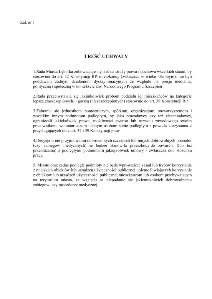 Wnioskodawcy oczekują, że Rada Miejska w Lęborku przyjmie oficjalne stanowisko w którym zobowiąże się do stania na straży prawa i dochowania wszelkich starań by zgodnie z Art. 32 Konstytucji RP mieszkańcy Lęborka, zwłaszcza w wieku szkolnym nie byli poddawani żadnym działaniom antydyskryminacyjnym ze względu na presję medialną, polityczną w kontekście tzw. Narodowego Programu Szczepień.