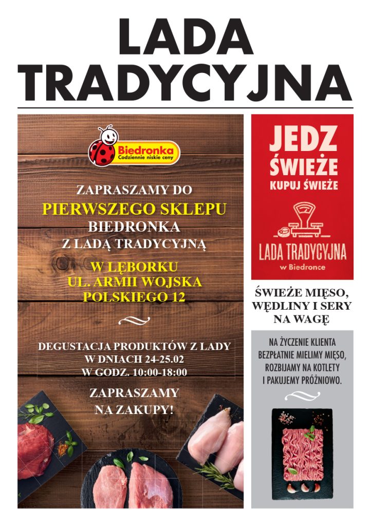 Dzisiaj o godzinie 6.00 w markecie Biedronka przy ulicy Armii WP 12 otworzono ladę tradycyjną. Jest to pierwsza Biedronka w Lęborku w której można kupić mięsa, wędliny i sery na wagę.