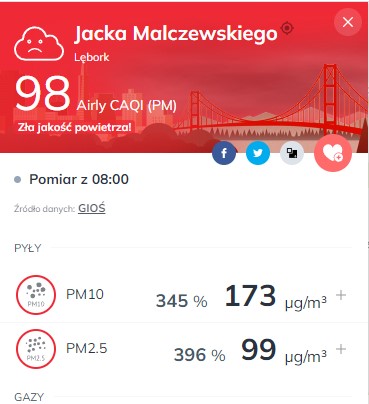 Jak widzimy stężenie PM10 w Lęborku przekracza, aż o 345% normę! PM10 to zanieczyszczenia powietrza o średnicy 10 mikrometrów (jedna tysięczna milimetra) lub mniej. Natomiast norma PM2.5 przekroczona jest, aż o 396%. PM2.5 to zanieczyszczenia powietrza o średnicy 2,5 mikrometra (jedna tysięczna milimetra) lub mniej.