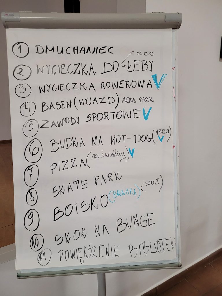 Dzieci z tematem poradziły sobie świetnie. Miały wiele pomysłów. Co ciekawe, wśród najczęstszych propozycji wcale nie wymieniano rozbudowy placów zabaw. Dominowały wspólnotowe działania, jak np. organizacja wycieczki, wyjścia do kina, czy zakup drobnego wyposażenia, który mógłby wzbogacić rodzinne pikniki.
