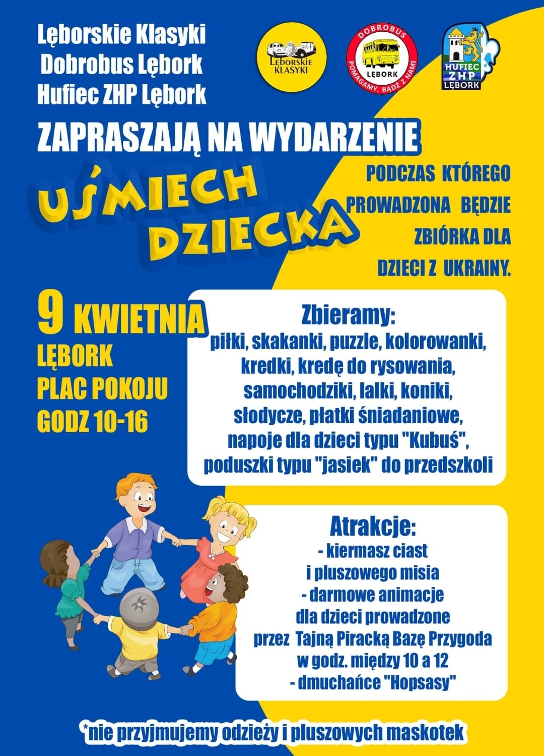W sobotę 9 kwietnia w godz. 10-16 na Placu Pokoju odbędzie się wydarzenie pod nazwą „UŚMIECH DZIECKA” – zbiórka dla dzieci z Ukrainy połączona z atrakcjami, głównie dla najmłodszych.
