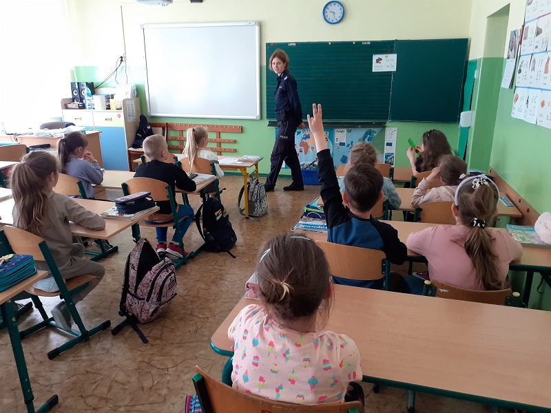 Policjanci spotykają się z uczniami najmłodszych klas podstawowych by uświadomić im z jakimi niebezpieczeństwami mogą spotkać się na obecnym etapie swojego życia i jak im przeciwdziałać.