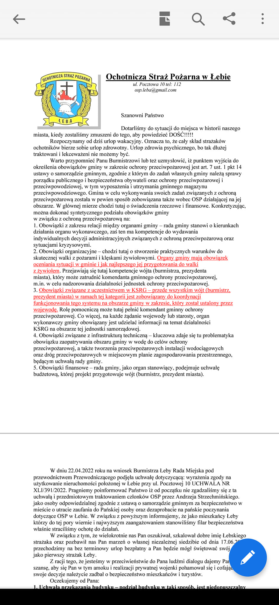 W imieniu mieszkańców oraz wypoczywającym w mieście turystów liczymy na osiągnięcie szybkiego porozumienia z Władzami Miasta, bo pozostawienie Łeby bez Straży Pożarnej zakrawa na żart…