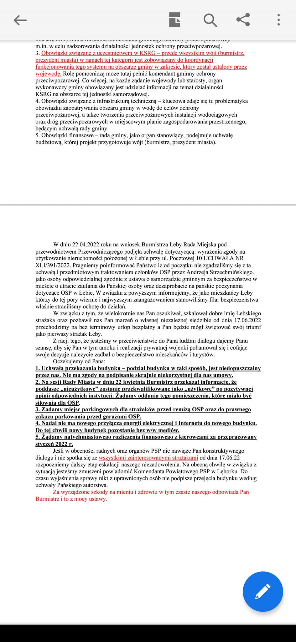 Na chwilę obecną strażacy domagają uchylenia uchwały Rady Miasta o przekazania/podziału budynku OSP Łeba w sposób skrajnie dla nich niekorzystny oraz „oddania” poddasza nieużytkowego, w którym miała powstać siłownia dla OSP. Strażacy „żądają” miejsc parkingowych przez remizą, prawnego zakazu parkowania przed garażami OSP oraz natychmiastowego rozliczenia finansowego z kierowcami za styczeń 2022 r. W dalszym ciągu oczekują też na nowe przyłącze energii elektrycznej i podłączenie internetu do nowego budynku OSP. O zaistniałej sytuacji strażacy z OSP Łeba powiadomili również Komendanta Powiatowego PSP w Lęborku.