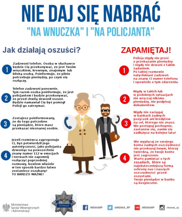 Policjanci przestrzegają mieszkańców przed oszustami wyłudzającymi od starszych osób pieniądze metodą na tzw. wnuczka czy policjanta. Sprawcy tego typu oszustw są często zatrzymywani dzięki pomocy osób, które mają świadomość tego, że mogą zostać oszukane. Niestety wciąż do policjantów docierają informacje o kolejnych pokrzywdzonych. Kiedy starsza osoba odbiera telefon od rzekomego „policjanta” z prośbą o pomoc w zatrzymaniu oszustów działających metodą na tzw. wnuczka, często przekazuje przestępcom oszczędności całego życia. Pamiętajmy, że w dalszym ciągu działają także osoby, które podając się np. za pracowników wodociągów, spółdzielni mieszkaniowych, pomocy społecznej czy osoby chętne do „pomocy” przy wypełnianiu wniosku o 14 emeryturę wchodzą do mieszkań, by okradać ich właścicieli.