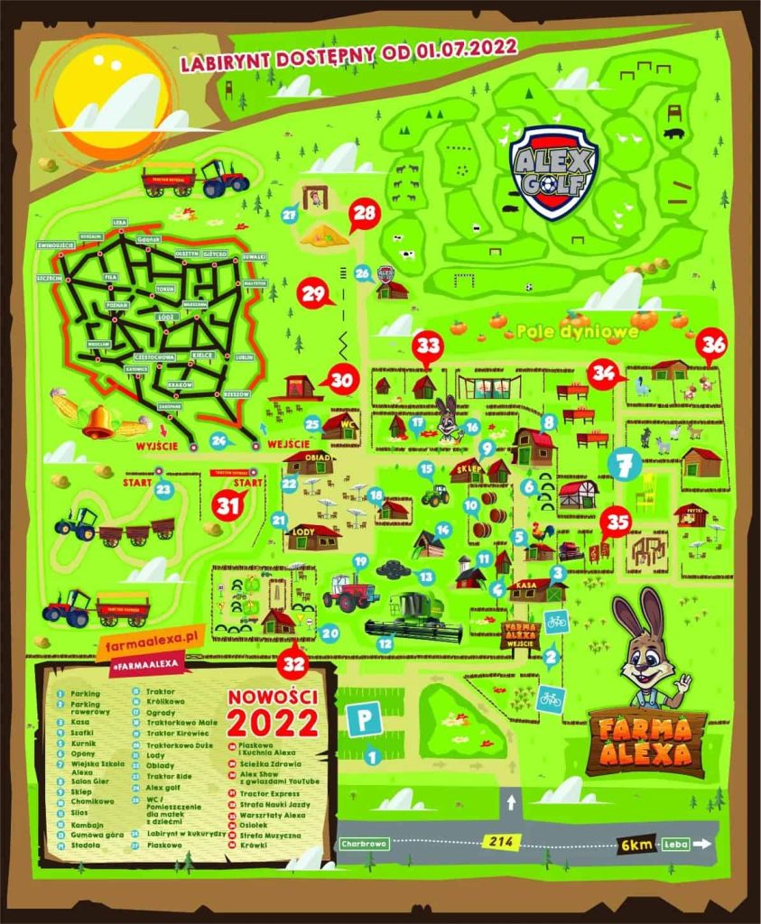 „Farma Alexa” to pierwszy w Polsce, założony w 2020 r. w Charbowie koło Łeby – rolniczy park rozrywki o powierzchni blisko 10 hektarów. W prawdziwie sielskiej atmosferze Królik Alex zaprasza do swojej wiejskiej krainy, w której przygotował całe mnóstwo atrakcji, gdzie każdy znajdzie coś dla siebie. Na terenie tego wyjątkowego parku rozrywki, położonego przy drodze wojewódzkiej „214” znajdziemy wiele atrakcji… Znajdują się tu traktory, kombajny, zwierzęta i cały świat Królika Alexa oraz jego przyjaciół. Do edukacyjnej zabawy zaprasza nas „Wiejska Szkoła Alexa”, do interakcji „Alex Show” w autorskim teatrze oraz intrygujący świat kwiatów, pól i warzyw. Na miłośników traktorów czekają przejażdżki traktorami na przyczepach oraz Park Maszynowy do zabawy.