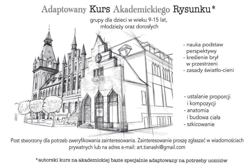 Pełny kurs rysunku przewidziany jest na 16 miesięcy nauki. Składa się z dwóch niezależnych bloków po 8 miesięcy. Każdy z nich daje nowy poziom umiejętności i wiedzy. W przyszłości przewidywane są dodatkowe krótkie kursy. Zajęcia indywidualne mogą odbywać się w dowolnym terminie i zakresie w zależności od potrzeb. Aby zarezerwować miejsce na kursie Tatiana prosi o przesłanie imienia i nazwiska ucznia oraz numeru telefonu na e-mail: art.tianashi@gmail.com, telefon > 570-628-316, https://www.facebook.com/tiana.shi.fb