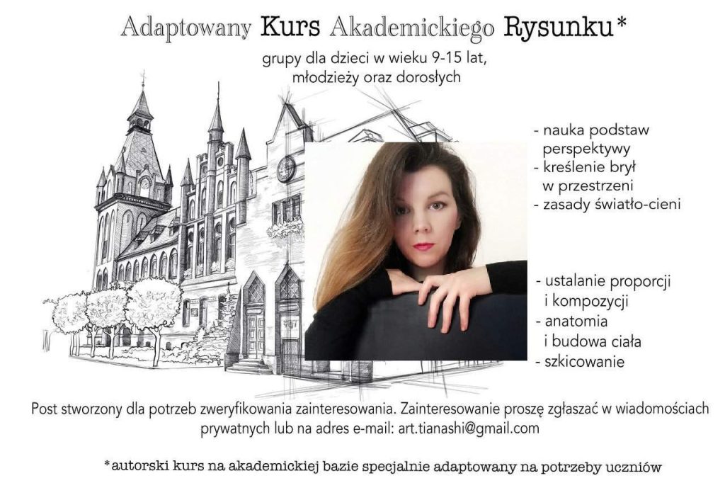 Tatiana to artystka z wykształceniem technik-architekt, Białorusinka z polskimi korzeniami. W 1939 r. część jej rodziny wyjechała do Polski a cześć pozostała na terenach obecnej Białorusi w okolicach Lidy i Baranowicz). W 2020 r. Tatiana przeprowadziła się do Polski, gdzie mieszka w Nowęcinie k/Łeby. Od marca do lipca br charytatywnie prowadziła integracyjne zajęcia z rysunku dla dzieci z Polski i Ukrainy. To doświadczenie dało jej do zrozumienia, że chciałaby kontynuować dzielenie się wiedzą. „Kurs Akademickiego Rysunku” stworzyła na bazie własnych doświadczeń i opinii osób, które w różny sposób próbowały nauczyć się rysunku. Dało to możliwość stworzenia kursu, który dba o profesjonalny rozwój kreatywności „kursanta” i zachowanie jego pasji do nauki, co dla Tatiany jest jednym z najważniejszych punktów edukacji.