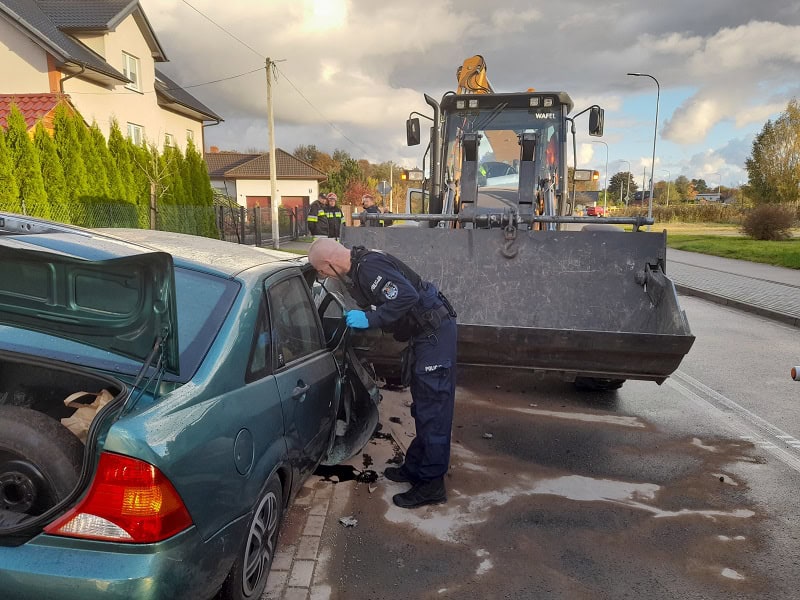 Wczoraj około godz. 08:00 rano na ul. Kanałowej policjanci z lęborskiej patrolówki zwrócili uwagę na kierującego fordem, który jechał bez włączonych świateł mijania i nie korzystał z pasów bezpieczeństwa. Gdy kierowca forda zauważył zawracający radiowóz gwałtownie przyspieszył. Nie reagował na nadawane sygnały do zatrzymania się, wjechał na rondo „pod prąd” i gwałtownie ściął zakręt wjeżdżając na ulicę Lotników. Jadąc lewą stroną jezdni zderzył się z koparką. Łyżka koparki wbiła się w przód forda.