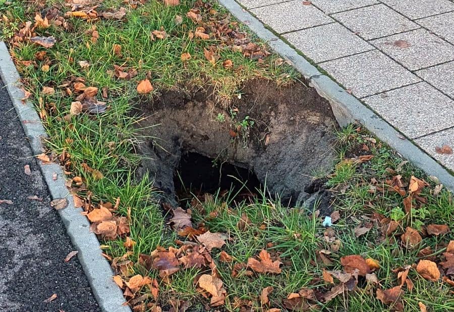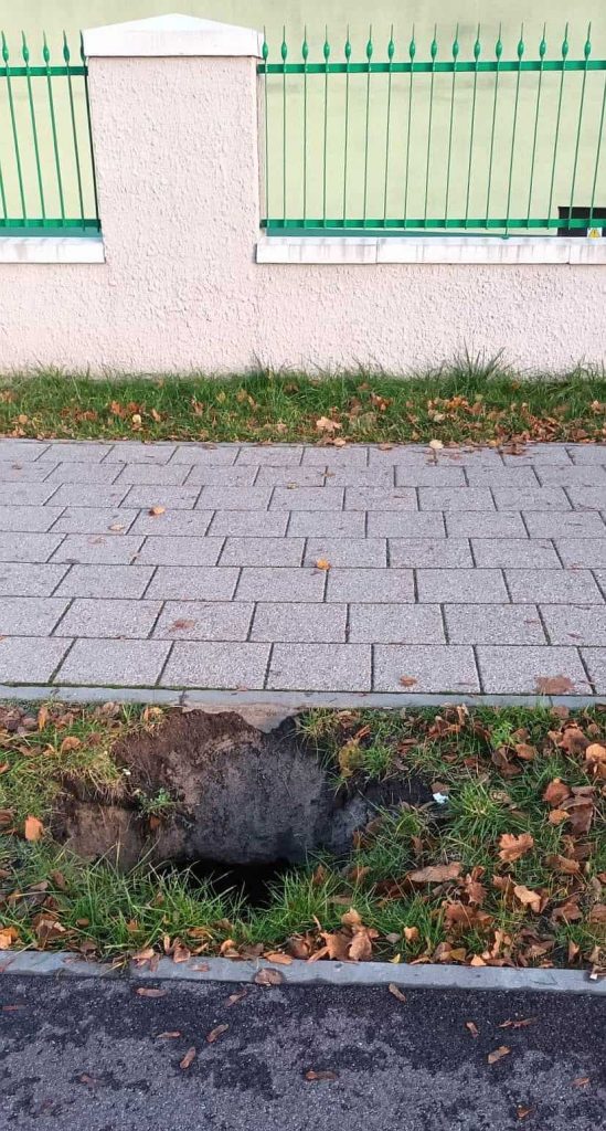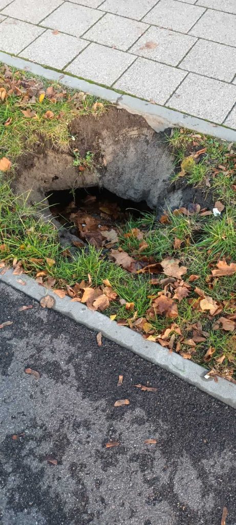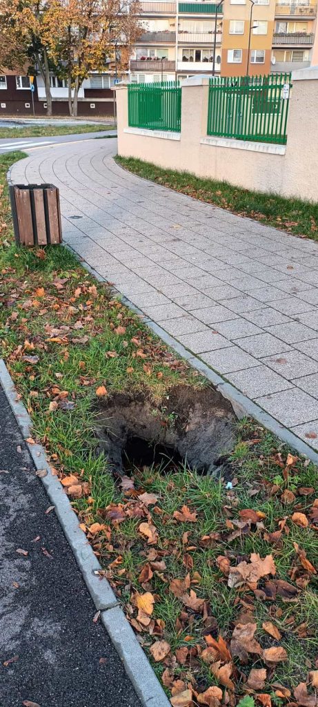 Przy ul. Wojska Polskiego, pod chodnikiem, przy ogrodzeniu tzw. „Rolniczaka”, czyli Zespołu Szkół Gospodarki Żywnościowej i Agrobiznesu w Lęborku, od blisko dwóch miesięcy znajduje się dość głęboka dziura. Doskonale widoczna za dnia, wieczorem może już stanowić spore zagrożenie. Z każdym opadem deszczu „dziura” ta staje się coraz szersza i głębsza. Co więcej głębokie na ok. 1,5 m „zapadlisko” stopniowo podchodzi już pod chodnik, który tym samym w każdej chwili może się zapaść. Chodnikiem koło „Rolniczaka” podąża codziennie wiele osób, m.in. dzieci i młodzież z pobliskiej Szkoły Podstawowej nr 1. Czy naprawdę musi się w tu coś wydarzyć, by ktokolwiek raczył interweniować ? W każdej chwili (szczególnie wieczorem) może ktoś w tę dziurę wpaść, co może się też skończyć poważnym urazem. Czekamy na pilną reakcję odpowiednich służb miejskich.