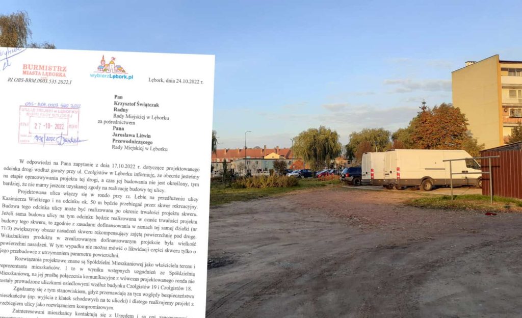 „Projektowana ulica włączy się w rondo przy rz. Łebie na przedłużeniu ulicy Kazimierza Wielkiego i na odcinku ok. 50 m będzie przebiegać przez skwer rekreacyjny. Budowa tego odcinka ulicy może być realizowana po okresie trwałości projektu skweru. Jeżeli sama budowa ulicy na tym odcinku będzie realizowana w czasie trwałości projektu budowy tego skweru, to zgodnie z zasadami dofinansowania w ramach tej samej działki (nr 71/3) zwiększymy obszar nasadzeń skweru rekompensujący zajętą powierzchnię pod drogę. Wskaźnikiem produktu w zrealizowanym dofinansowanym projekcie była wielkość powierzchni nasadzeń. W tym wypadku nie można mówić o likwidacji części skweru tylko o jego przebudowie z utrzymaniem parametru powierzchni.