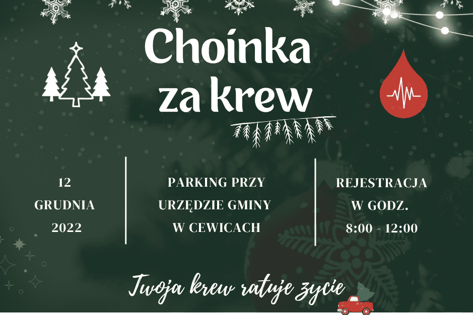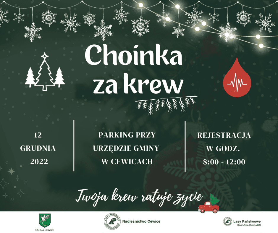 Przed Urzędem Gminy w Cewicach ponownie stanie mobilny punkt poboru krwi. Tym razem akcja poboru krwi zostanie zorganizowana razem z Nadleśnictwem Cewice, które przekaże choinki bożonarodzeniowe w zamian za oddaną krew. Świąteczne drzewko otrzyma każdy, kto 12 grudnia br. odda krew w krwiobusie. Dawcy otrzymają voucher, który będą mogli wymienić w siedzibie Nadleśnictwa Cewice na wybrane drzewko w dowolnym terminie. Krwiobus będzie stacjonował na parkingu przed Urzędem Gminy w Cewicach. Rejestracja dawców będzie odbywać się w godzinach 8:00-12:00. Wszystkie osoby, które chcą i mogą podzielić się krwią zachęcamy do wzięcia udziału w akcji „Choinka za krew”, wystarczy przyjść z dokumentem tożsamości. Organizatorzy akcji zapraszają wszystkie zainteresowane osoby… Twoja krew ratuje życie! Ciekawa akcja, szczytny cel!
