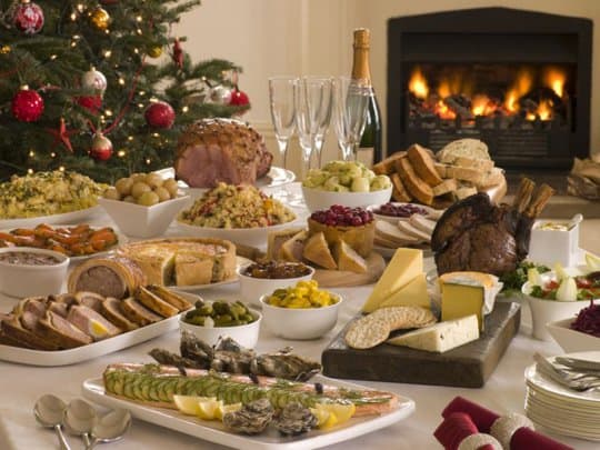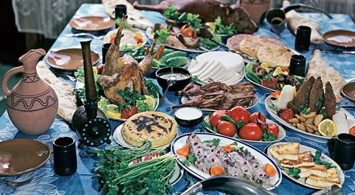 W licznych regionach Gruzji na Boże Narodzenie przygotowuje się różne potrawy. W Imeretii, Gurii i Megrelii popularne jest danie z indyka (lub kurczaka) w sosie orzechowym (saciwi). W zachodniej Gruzji szczególną uwagę zwraca się na słodycze: miód, orzechy, suszone owoce. O wschodzie słońca gospodynie zaczynają gotować tradycyjną wigilijną kutię z ziaren pszenicy. Piekły też specjalne placki brindżuła z ryżem i serem oraz pierożki z soją, zwane janpoczi lub kada, którymi częstowały kolędników. Tradycja przygotowywania napoju świątecznego cchracwena (dosłownie „dziewięć soków”), który składał się z dziewięciu ziaren: jęczmienia, prosa, pszenicy, fasoli, bobu, dzikiego (czarnego) groszku itp., zachowała się do dziś wśród tureckich Gruzinów, mieszkających w Izmirze.