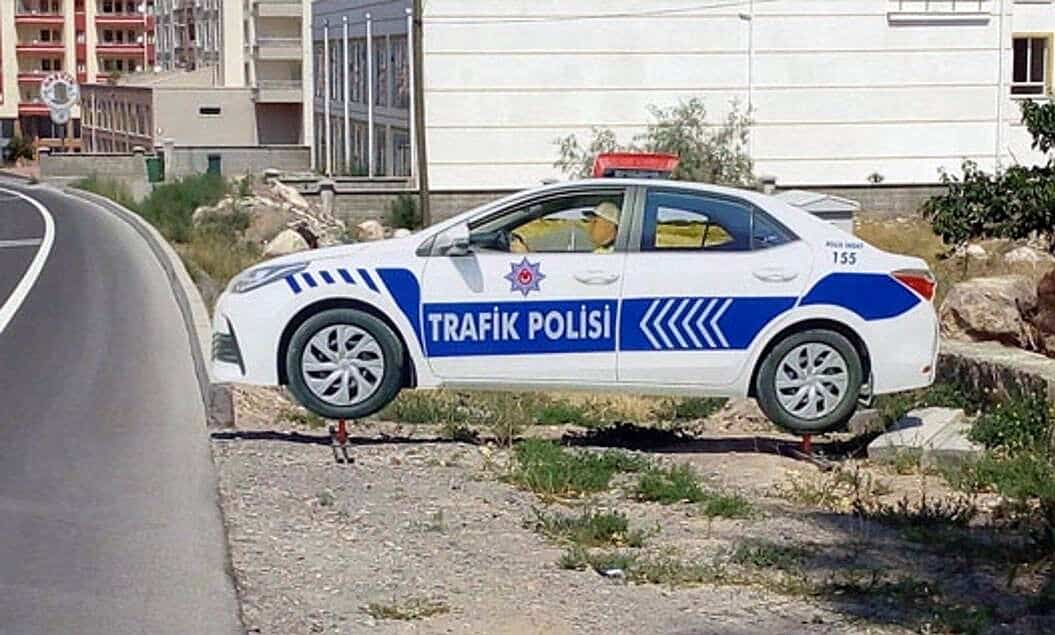 O modelach pojazdów tureckiej policji, które w każdej chwili można przetransportować w dowolne miejsce. W chwili obecnej na tamtejszych drogach funkcjonuje już ponad 350 miejsc, gdzie „działa” taki pojazd. Jako, że turecka policja ma obowiązek całodobowego używania sygnałów świetlnych (tzw. kogutów), w podobne urządzenia są też zaopatrzone modele tureckich radiowozów. Są one „ładowane” energią słoneczną i świecą przez całą dobę, zupełnie jak te prawdziwe. Od pewnego czasu przy modelach radiowozów stawiane są też „modele” wyróżniających się funkcjonariuszy drogówki… co działa rzekomo bardzo prestiżowo w środowisku tamtejszej policji.