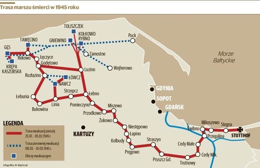W dn. 25 stycznia 1945 roku komendant obozu SS-Obersturmbannführer Paul Werner Hoppe wydał rozkaz ewakuacji więźniów z KL Stutthof. Mordercza tułaczka blisko 33.000 osób (11.000 z obozu głównego i blisko 22.000 z tzw. „podobozów”) miała zakończyć się w lęborskiej szkole podoficerów SS. Żaden z wygłodzonych więźniów nigdy nie dotarł jednak nigdy do celu. Maszerowali o głodzie, w ciszy oraz mrozie sięgającym −20°C. Wskutek wycieńczenia, chorób, zimna oraz mordów życie straciło prawie 17.000 osób.