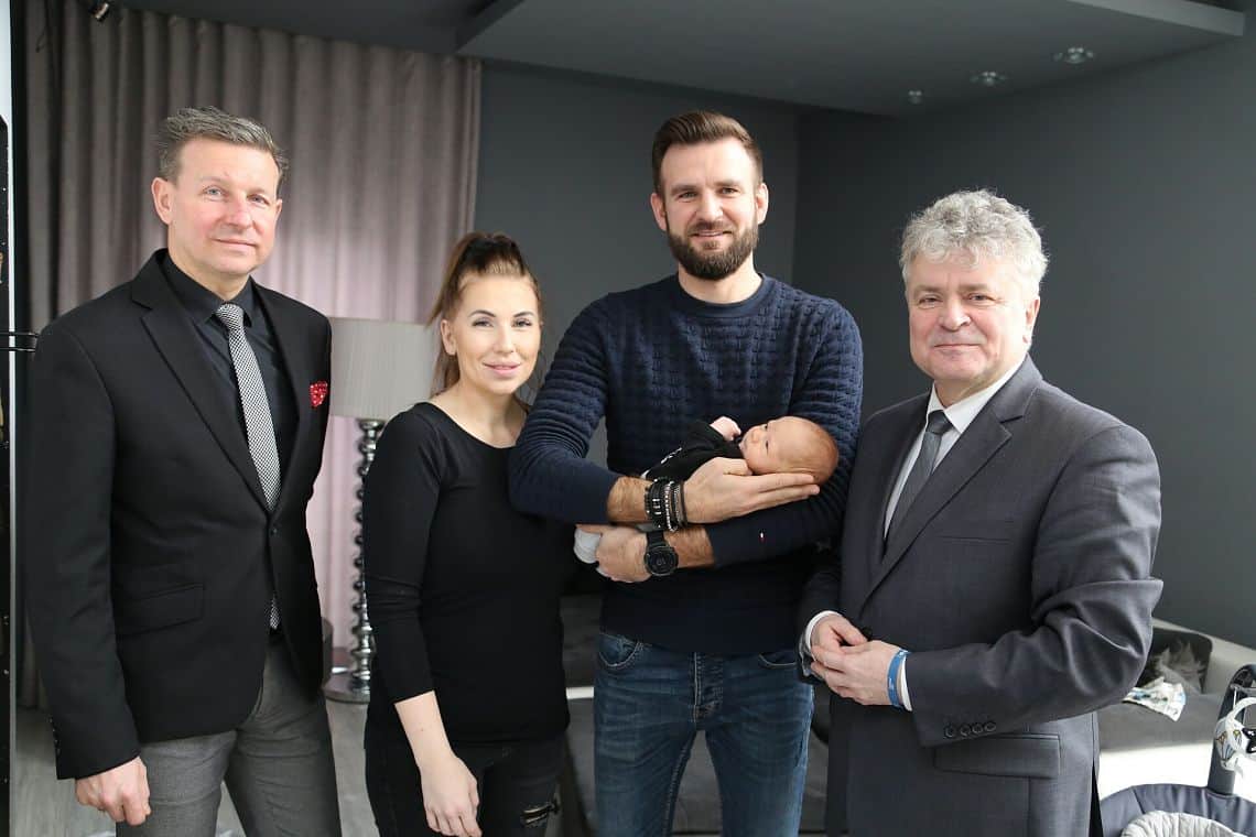 Burmistrz Lęborka Witold Namyślak oraz Sekretarz Miasta Marian Kurzydło złożyli wizytę pierwszemu urodzonemu w 2023 roku dziecku.