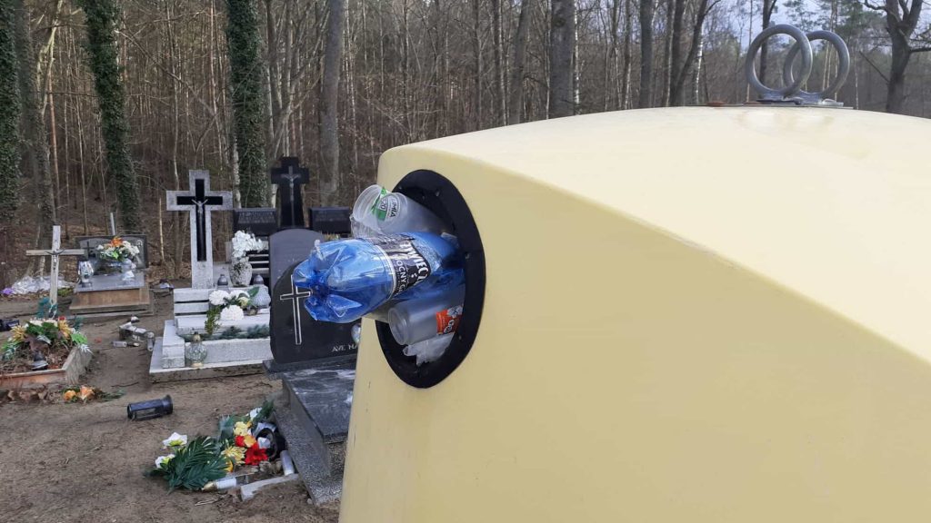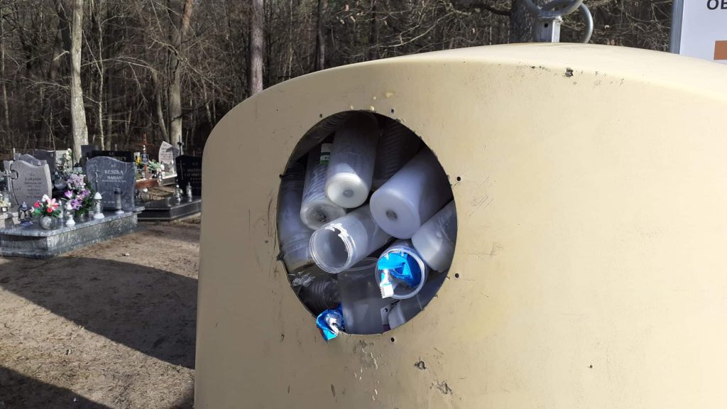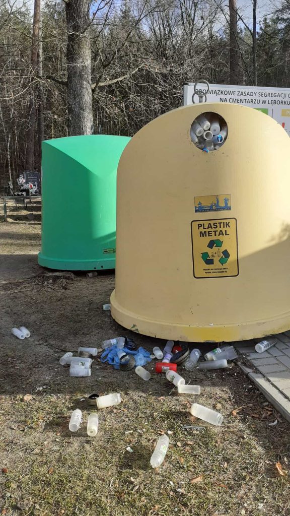 Bywają miejsca w którym nie ma dostępnych pojemników na wszystkie trzy frakcje odpadów. Najczęściej zgrupowane są ze sobą pojemniki na plastik i szkło. Opady zielone wrzuca się w innej części cmentarza co może zniechęcać do segregacji.