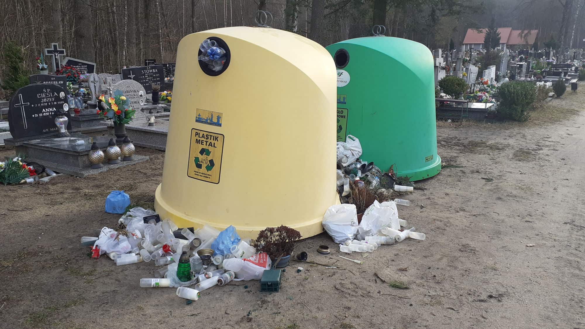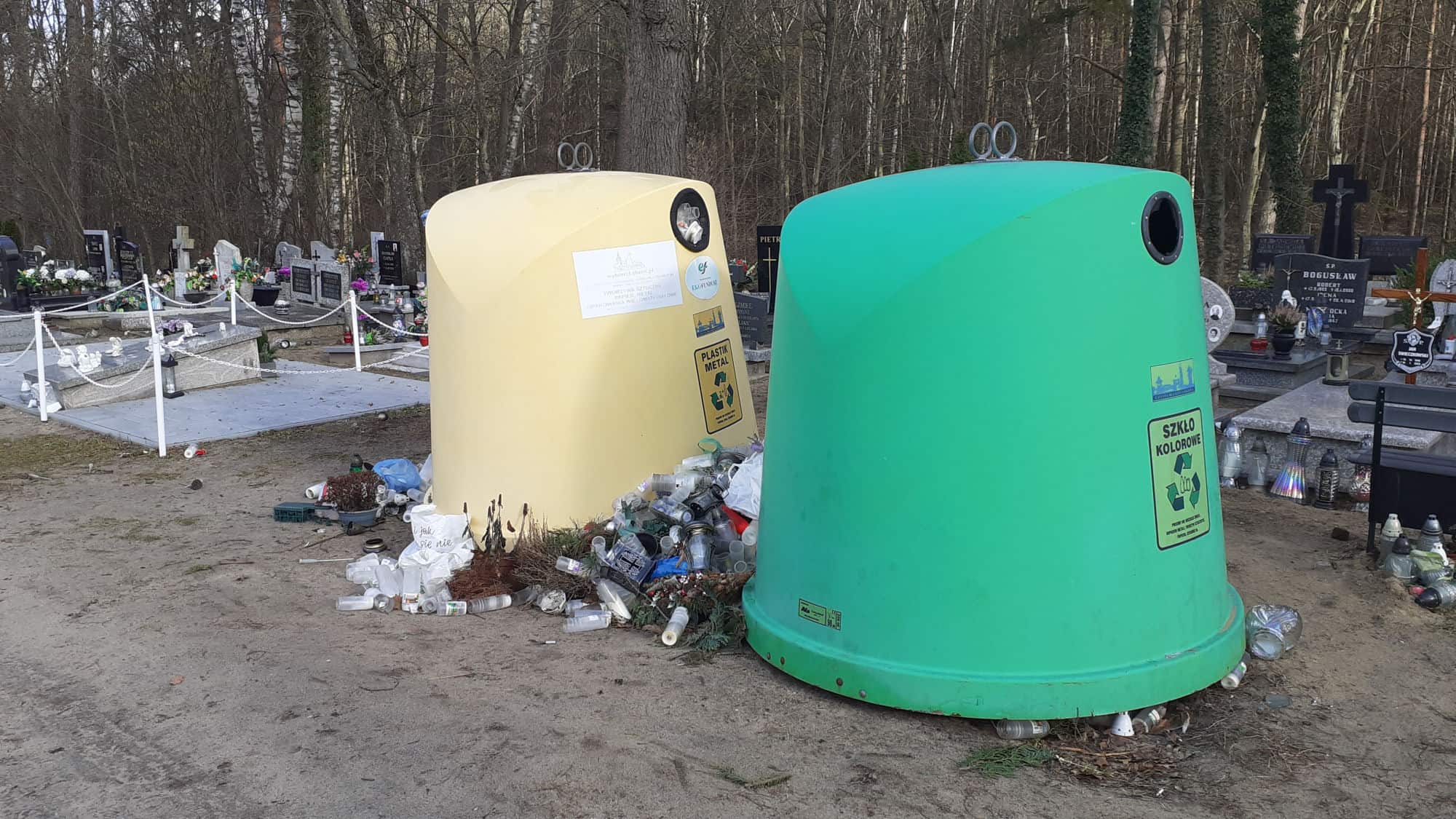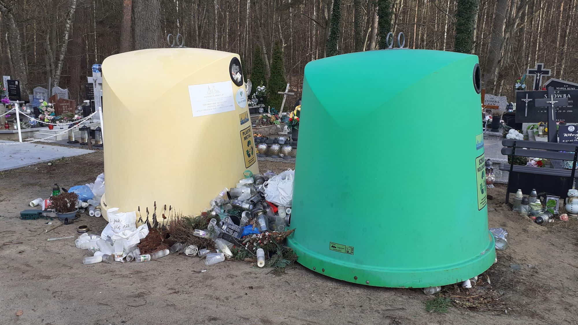 Bywają miejsca w którym nie ma dostępnych pojemników na wszystkie trzy frakcje odpadów. Najczęściej zgrupowane są ze sobą pojemniki na plastik i szkło. Opady zielone wrzuca się w innej części cmentarza co może zniechęcać do segregacji.