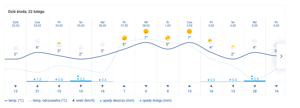 Jak pokazuje prognoza pogody do końca tego tygodnia temperatura będzie poniżej 5 stopni celcjusza, lecz od poniedziałku 27 lutego słońce! Temperatura powoli będzie rosła.