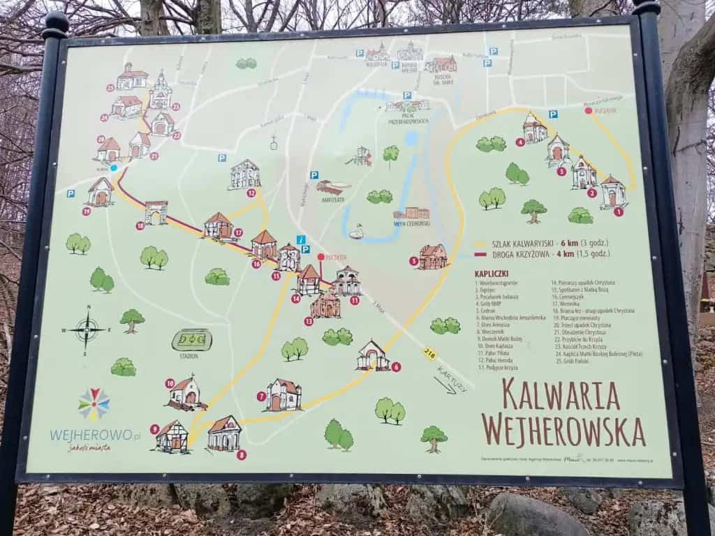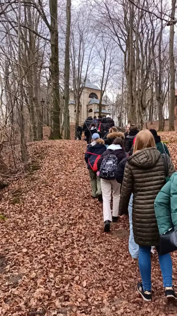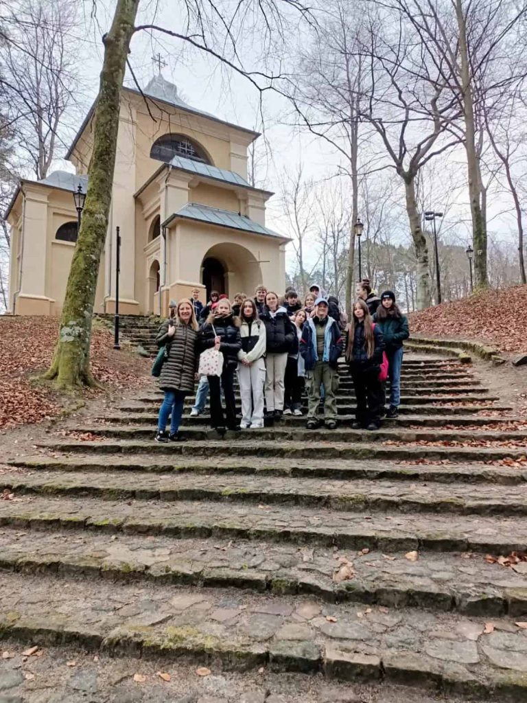 Na wzgórzach zbudowanej w latach 1649–1655 kalwarii jest 26 kaplic, a cały szlak kalwaryjski liczy 4,6 km długości. Przejście go w całości jest możliwe w około 2,5 godziny. Uczniowie wybrali popularną wśród pielgrzymów, krótszą trasę wedle czternastu stacji drogi krzyżowej, co zajęło im około godziny. Przy każdej z nich młodzież czytała rozważania Męki Pańskiej. Modlono się też m.in. w kościele Trzech Krzyży.