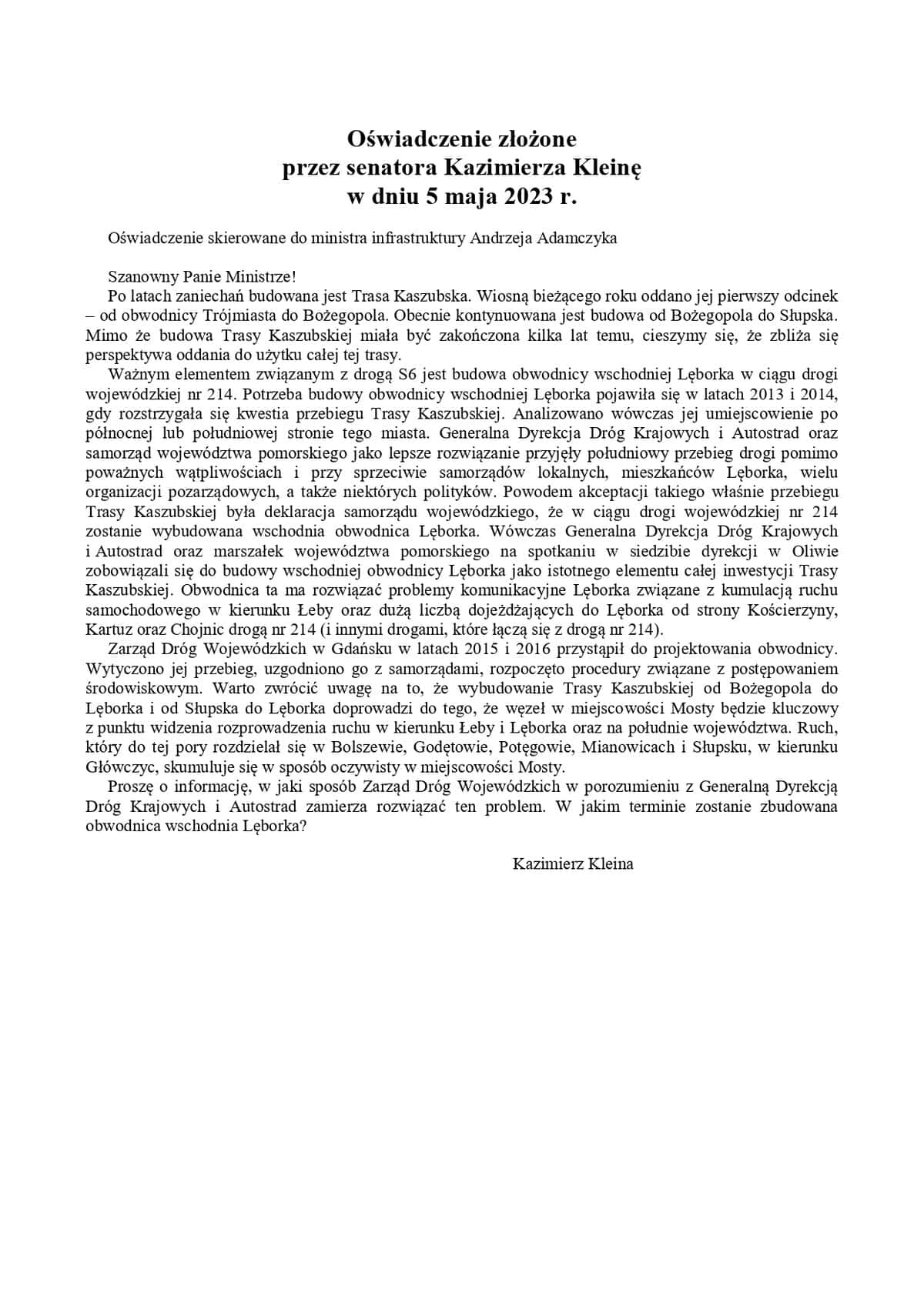 Senator RP Kazimierz Kleina skierował oświadczenie do ministra infrastruktury Andrzeja Adamczyka, w którym pyta, jak zostanie rozładowany ruch samochodów w Mostach po oddana do użytku drogi S6. Senatora interesuje również, kiedy zostanie wybudowana wschodnia obwodnica Lęborka.
