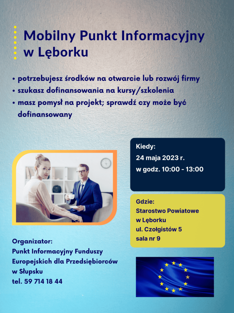 Jeśli potrzebujesz pieniędzy na otwarcie i rozwój swojej firmy, punkt informacyjny Funduszy Europejskich dla Przedsiębiorców w Słupsku zaprasza na indywidualne konsultacje podczas dyżuru w ramach Mobilnego Punktu Informacyjnego w Lęborku. Przyjdź i zapytaj o także dofinansowanie na kursy i szkolenia.