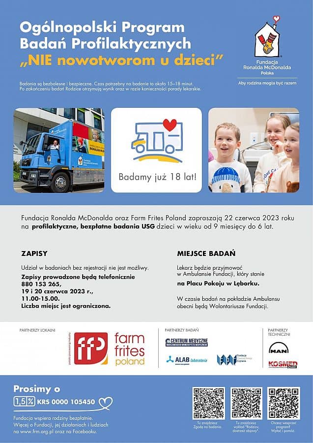Ambulans Fundacji Ronalda McDonalda stanie na lęborskim Placu Pokoju. 22 czerwca w ramach specjalnej edycji badań „NIE nowotworom u dzieci” będą mogli bezpłatnie przebadać się dzieci z Lęborka i okolic.