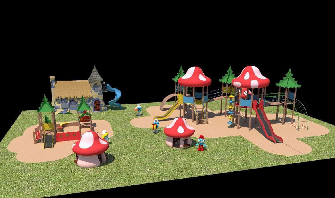 Na placu zabaw znajdą się też trzy domki Smerfów w postaci muchomora z drzwiczkami, a także dwa większe domki, z których będą wyprowadzone zjeżdżalnie. Wrażenie z pewnością zrobi mroczny zamek Gargamela, z którego będzie można się wydostać zakręconą zjeżdżalnią, a w środku również będzie można się pobawić. Smerfów z zamku będzie doglądać Garagmel z Klakierem. Zaplanowano też zagrodę z bramą wejściową i zjeżdżalniami. Jak zapewnia wójt, prawie wszystkie elementy są już gotowe do montażu.