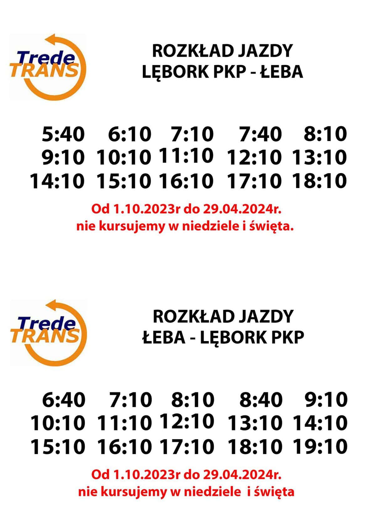 Nowy rozkład funkcjonuje od 1 października i będzie obowiązywał do 29 kwietnia 2024 r. Łącznie przewoźnik zaplanował 15 kursów z Lęborka do Łeby, czyli o jeden więcej niż podczas sezonu wakacyjnego. Pierwszy z nich spod lęborskiego dworca PKP odbywa się o godzinie 5:40, a z Łeby o 6:40. Natomiast ostatni kurs z Lęborka ma miejsce o 18:10, a z Łeby o 19:10.