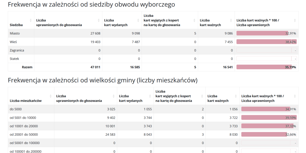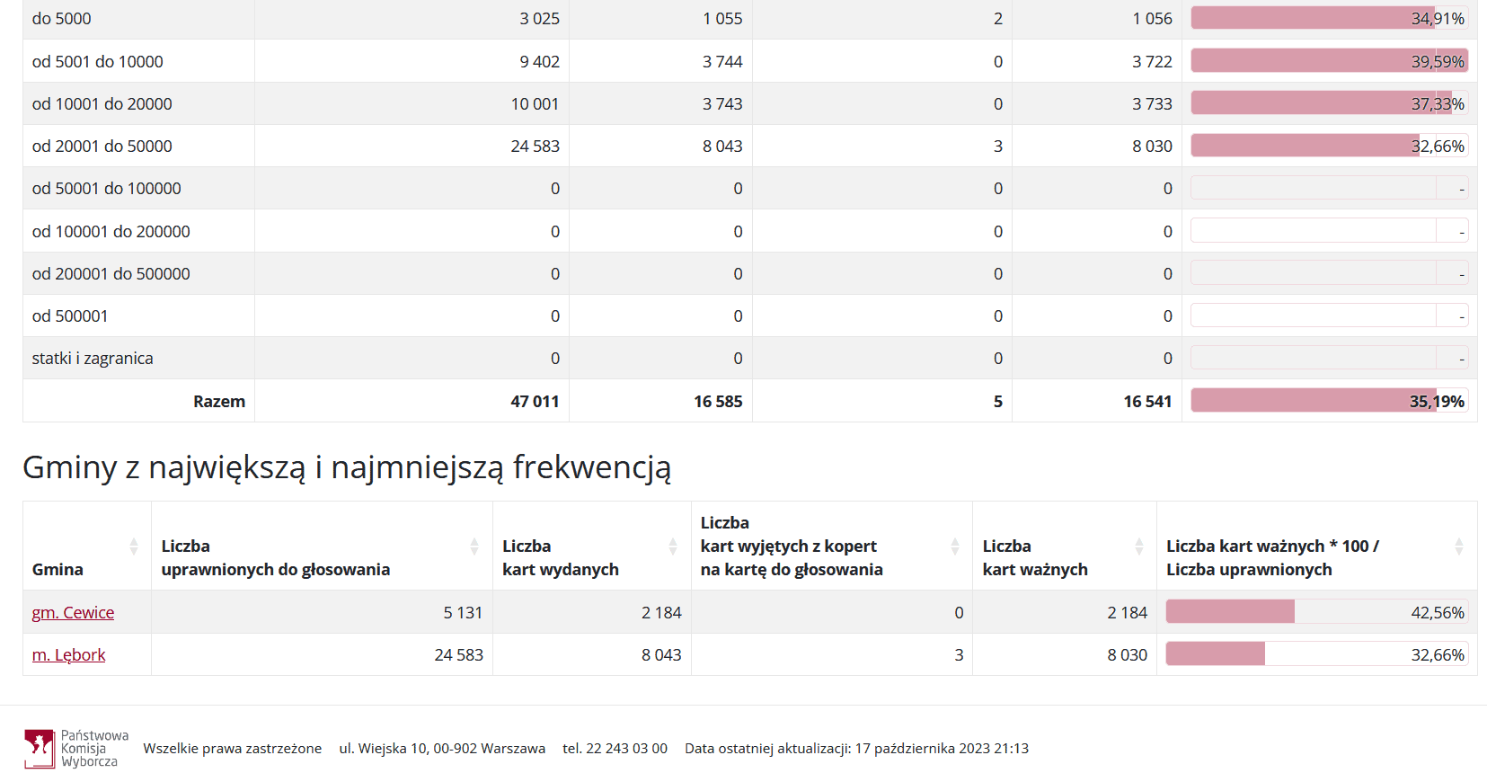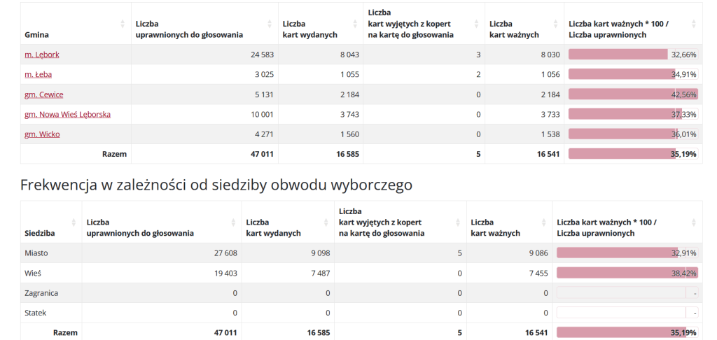 W powiecie lęborskim frekwencja wyniosła 35,19%, a województwie pomorskim 33,93%,