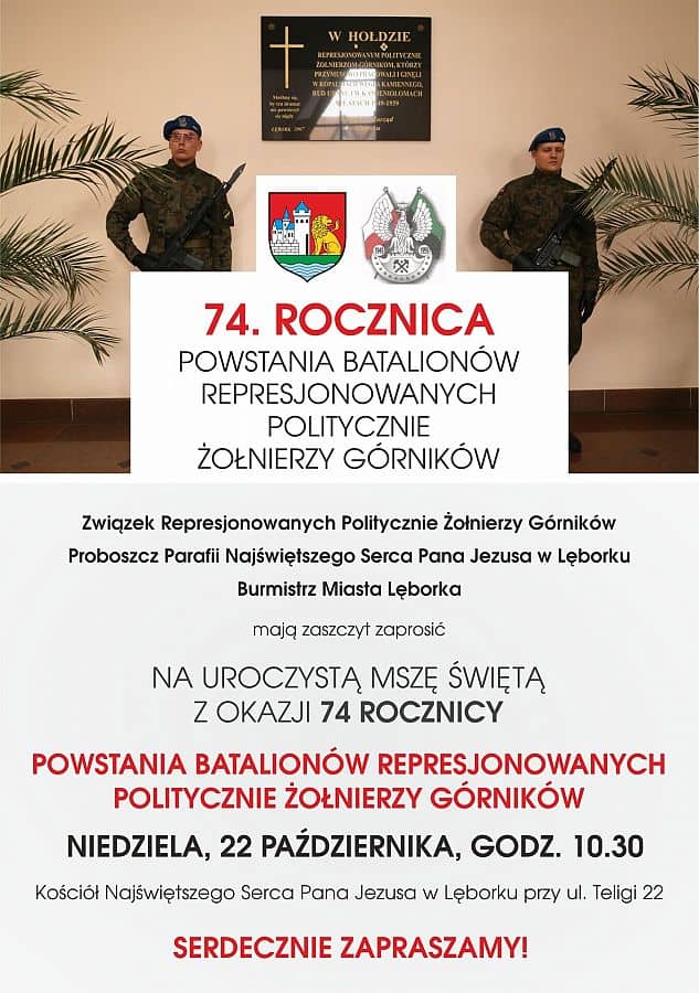 W kościele pw. Najświętszego Serca Pana Jezusa w Lęborku odprawiona zostanie uroczysta Msza Św. z okazji 74. rocznicy powstania Batalionów Represjonowanych Politycznie Żołnierzy-Górników.