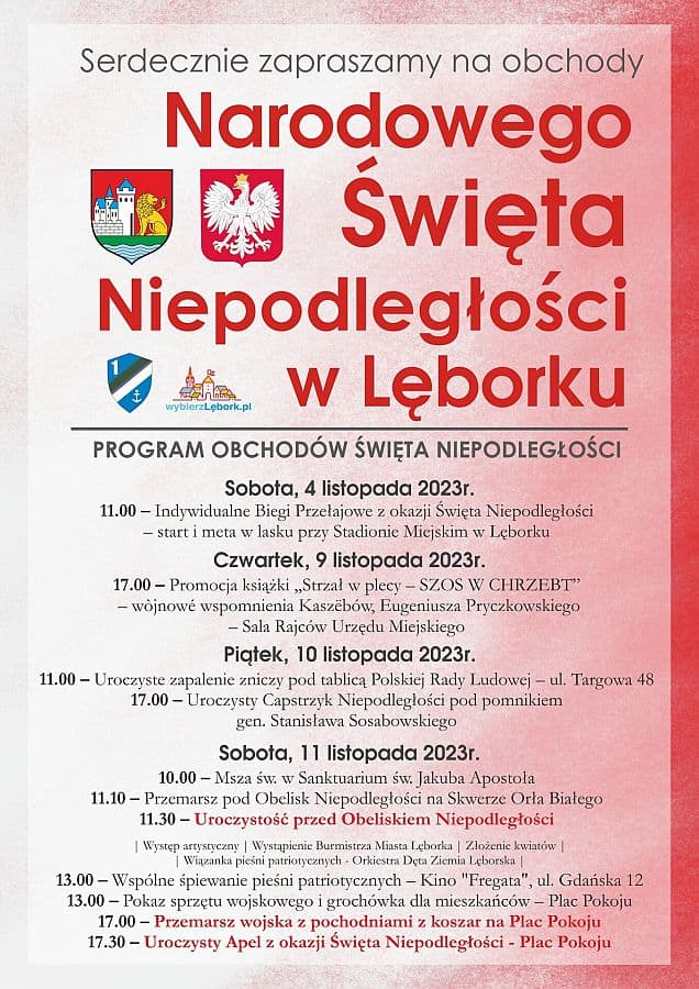 Już w przyszłą sobotę, 11 listopada, będziemy świętować 105. rocznicę odzyskania przez Polskę niepodległości. Z tej okazji w Lęborku zaplanowano wiele wydarzeń, których kulminacją będą uroczystości przy Obelisku Niepodległości na skwerze Orła Białego oraz uroczysty apel na placu Pokoju.