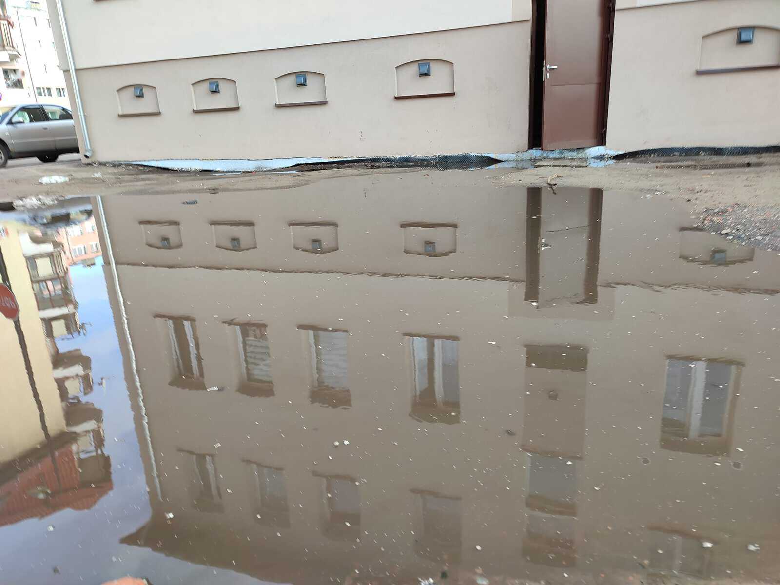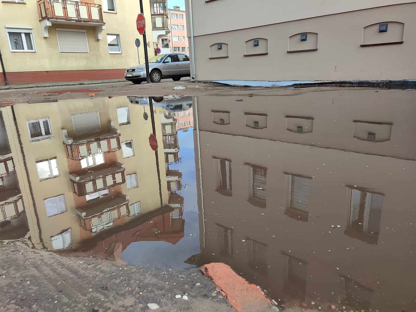 Podwórko przy ul. Grunwaldzkiej 9-12 od dawna jest miejscem, na którym po intensywnych opadach deszczu tworzą się gigantyczne kałuże. Nie ma tam chodnika, a mieszkańcy muszą chodzić slalomem, żeby nie wpaść do wody lub błota. Problem zrobił się jeszcze bardziej uciążliwy w wyniku prowadzonych pracy rewitalizacyjnych. Kałuże uniemożliwiają mieszkańcom opuszczenie budynku, a w dodatku podmywają świeżo obrobione fundamenty.
