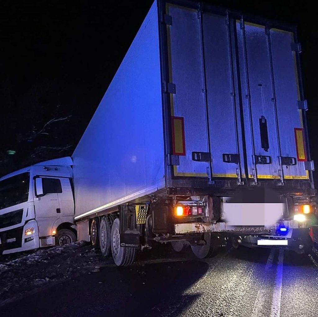 Do groźnie wyglądającego zdarzenia doszło we wtorek, 16 stycznia, tuż przed godziną 18:00 w Pogorzelicach w gminie Nowa Wieś Lęborska. Policjanci na miejscu zdarzenia drogowego ustalili, że kierujący ciężarowym manem z naczepą, jadąc na oblodzonym odcinku drogi, nieprawidłowo zahamował w wyniku czego doprowadził do zablokowania kół naczepy. Przód pojazdu wypadł z pasa ruchu, a w poprzek jezdni pozostała naczepa, blokując pas ruchu w kierunku Słupska.
