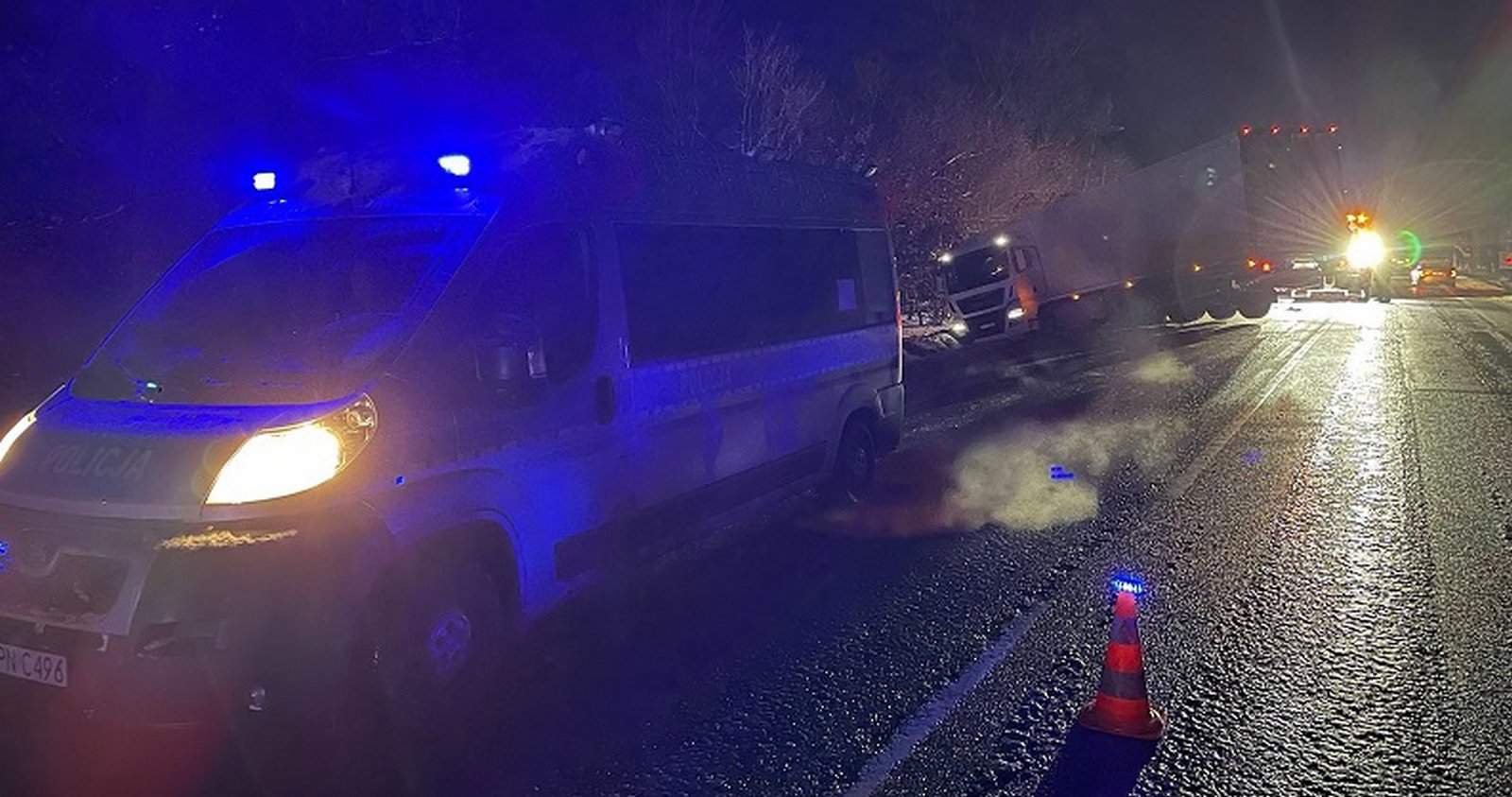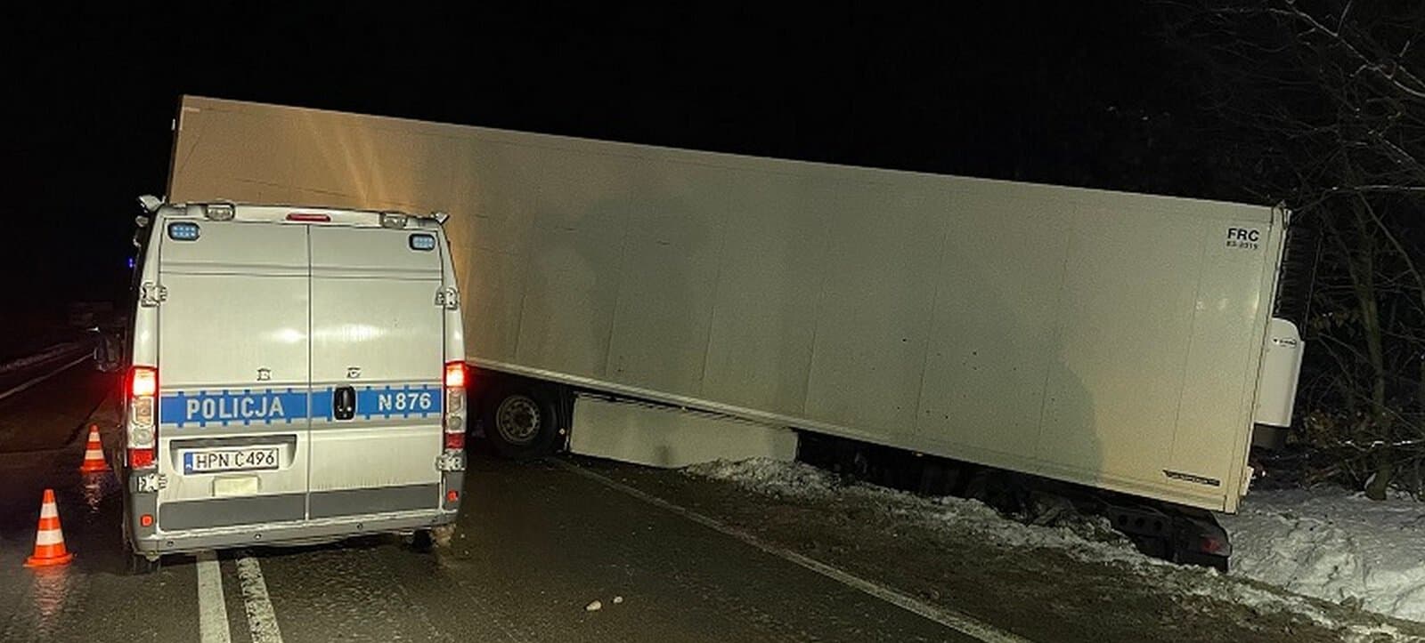 Do groźnie wyglądającego zdarzenia doszło we wtorek, 16 stycznia, tuż przed godziną 18:00 w Pogorzelicach w gminie Nowa Wieś Lęborska. Policjanci na miejscu zdarzenia drogowego ustalili, że kierujący ciężarowym manem z naczepą, jadąc na oblodzonym odcinku drogi, nieprawidłowo zahamował w wyniku czego doprowadził do zablokowania kół naczepy. Przód pojazdu wypadł z pasa ruchu, a w poprzek jezdni pozostała naczepa, blokując pas ruchu w kierunku Słupska.
