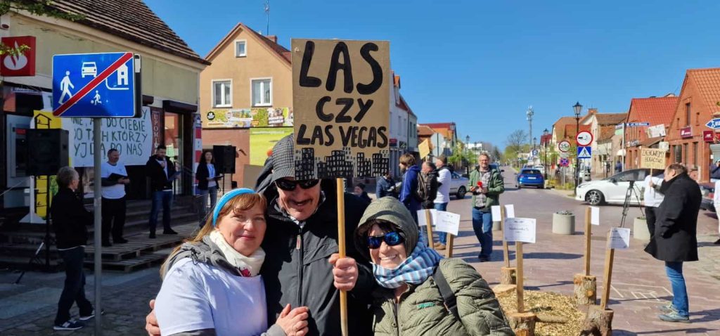 Podczas niedzielnego protestu na środku deptaku na ul. Kościuszki odpalono piły łańcuchowe i ustawiono ścięte pnie drzew z tabliczkami w formie nekrologów: „Nadmorska 33” oraz „Mierzeja Sarbska”. Przyniesiono też transparenty z różnymi napisami, w tym: „Las to nie firma”, „Nie dla betonu”, „Wycinkę zostawmy bobrom”, „Szanuj drzewa”, „Las to życie”, „Zachowajmy bogactwo natury”, „Nie sprzedamy się dla kasy, bo kochamy nasze lasy”, „Chcemy Łeby błękitno-zielonej” oraz „Las czy Las Vegas?”. Był również napis „Ten dom nie należy do mnie ani do ciebie, ale do tych, którzy przyjdą po nas”. Przez mikrofon informowano o planowanej wycince setek drzew i katastrofie ekologicznej. Zbierano też podpisy pod petycją papierową przeciwko budowie hotelu. Można także wypełnić petycję online klikając w poniższy link. Dotychczas poparło ją 566 osób: