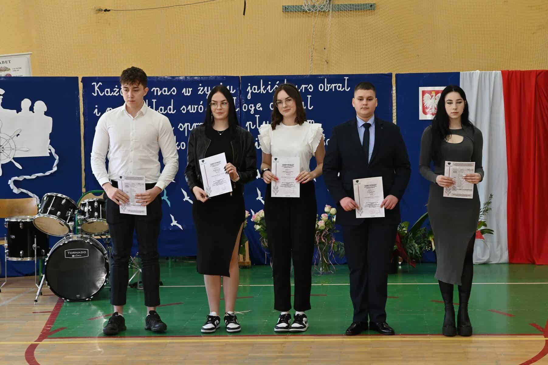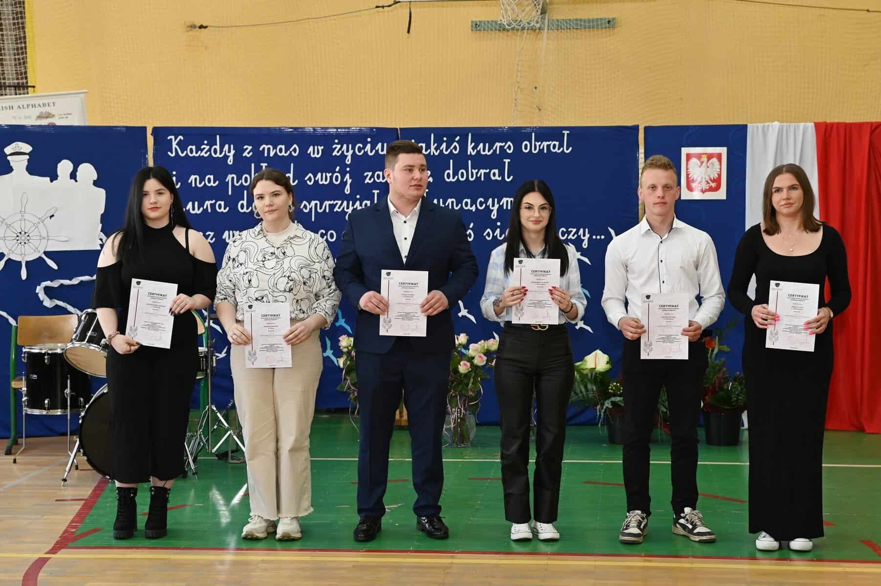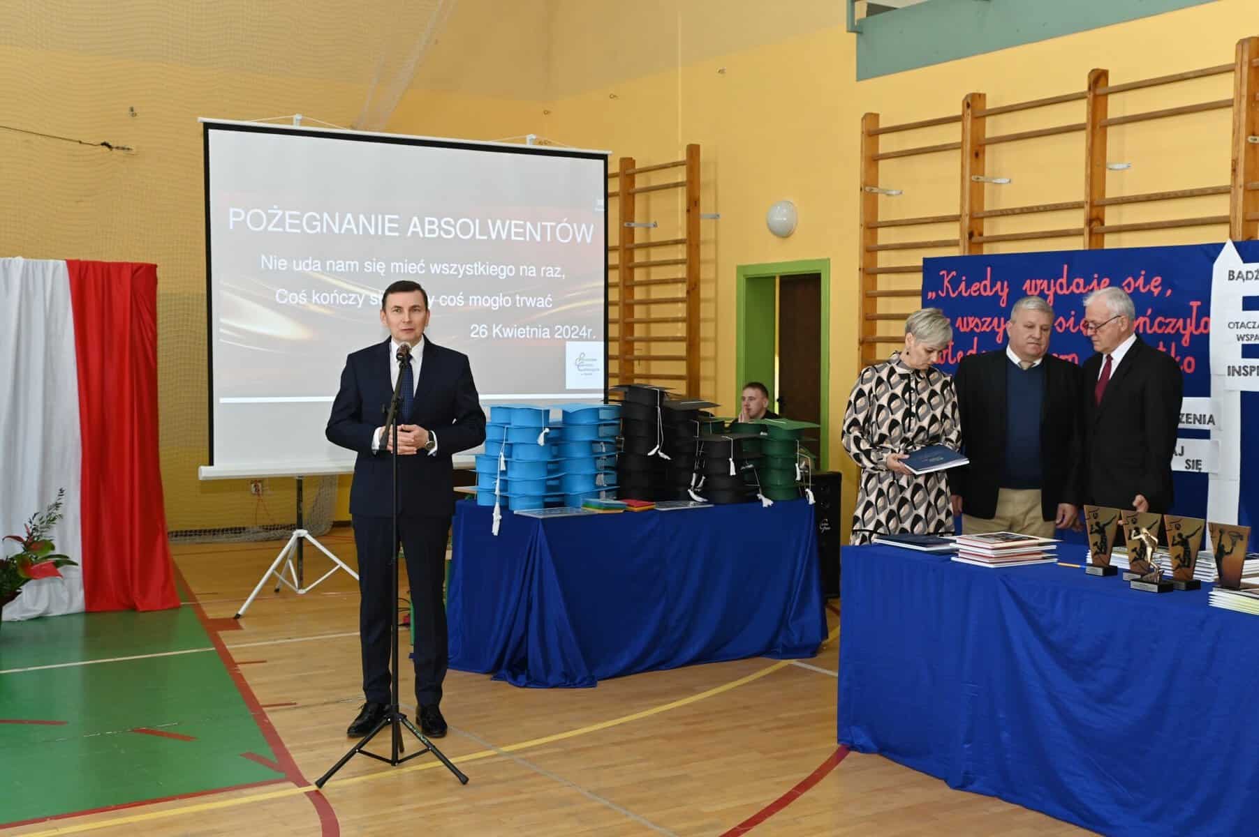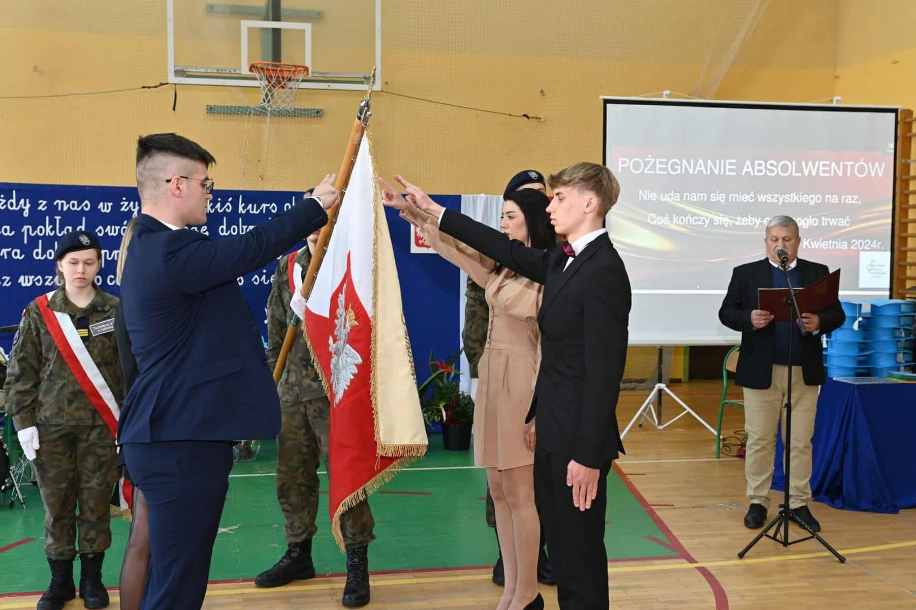 – Każde z umieszczonych tu słów ma swój głęboki sens – powiedziała starosta powiatu lęborskiego Alicja Zajączkowska, odnosząc się do tych słów. – Wy dzisiaj jesteście kapitanami swojego okrętu, swojego życia. Wy sami musicie zdecydować kogo dobierzecie na swój pokład. Życzę, żebyście dobrali jak najlepiej. A na nadchodzące egzaminy, życzę wam szczęścia, podobnie jak na wszystkie inne życiowe egzaminy, które kiedyś w przyszłości będziecie musieli zdawać. Życzenia mądrych życiowych wyborów przekazał absolwentom także ppłk Michał Michalski, dowódca 1. Lęborskiego Batalionu Zmechanizowanego im. gen. Jerzego Jastrzębskiego, współpracującego ze szkołą w zakresie realizacji programu przygotowania wojskowego. – Życzę wam, żebyście mieli na siebie pomysł. Żeby droga, którą wybierzecie była zgodna z waszymi ambicjami, zainteresowaniami, abyście czuli się spełnieni czy to w pracy zawodowej, czy w dalszej nauce.