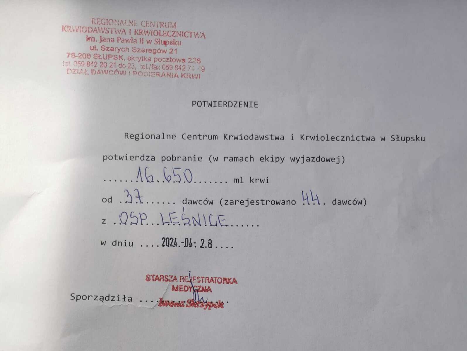 Akcję zorganizowano w niedzielę, 28 kwietnia. Rejestracja dawców trwała w godzinach od 8 do 13. Na wszystkich przybyłych na teren remizy strażackiej OSP Leśnice czekał krwiobus z Regionalnego Centrum Krwiodawstwa i Krwiolecznictwa w Słupsku. Łącznie zarejestrowały się 44 osoby, a krew pobrano od 37 z nich. Byli wśród nich m.in. druhowie z OSP Krępa Kaszubska, OSP Pogorszewo, OSP Tawęcino i OSP Lębork.
