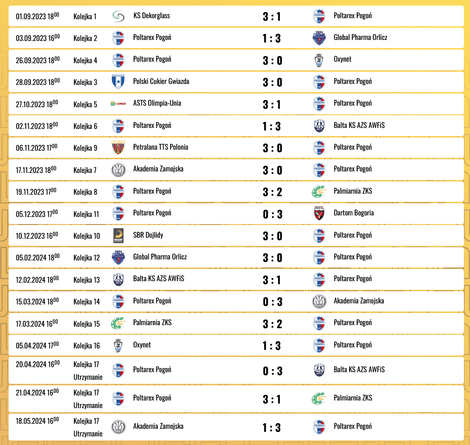 Przypomnijmy, że w większość meczów rundy rewanżowej kończyły się porażkami Pogoni kolejno z zespołami Global Pharma Orlicz 1924 Suchedniów 0:3, KS AZS AWFiS Balta Gdańsk 1:3, Akademią Zamojską Trefl Zamość 0:3 i Palmiarnią Zielona Góra 2:3. W sobotę, 20 kwietnia, w derbach Pomorza Pogoń ponownie przegrała u siebie z Balta AZS AWFiS Gdańsk 0:3. Zwycięstwo udało się odnieść na wyjeździe, 5 kwietnia, z Oxynet Jarosław 3:1 oraz 21 kwietnia u siebie ze spadkowiczem Palmiarnią Zielona Góra 3:1. Więcej o tych meczach czytaj: