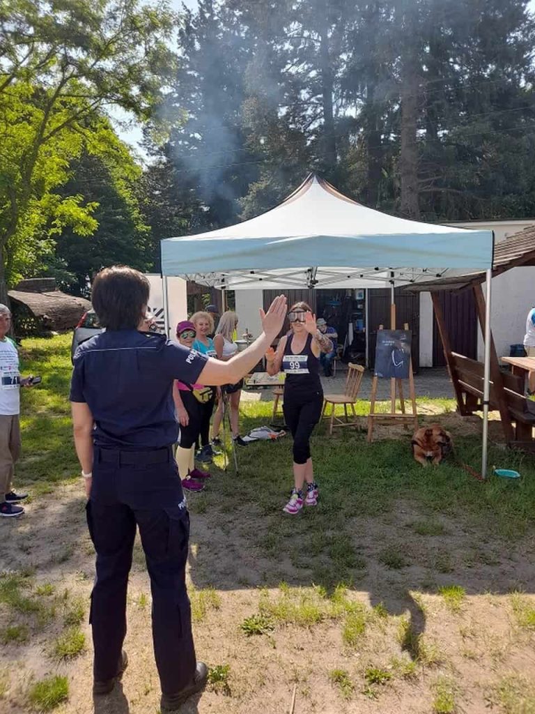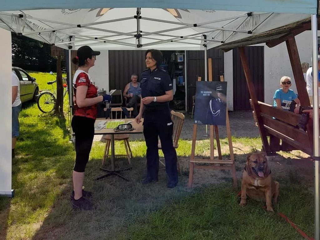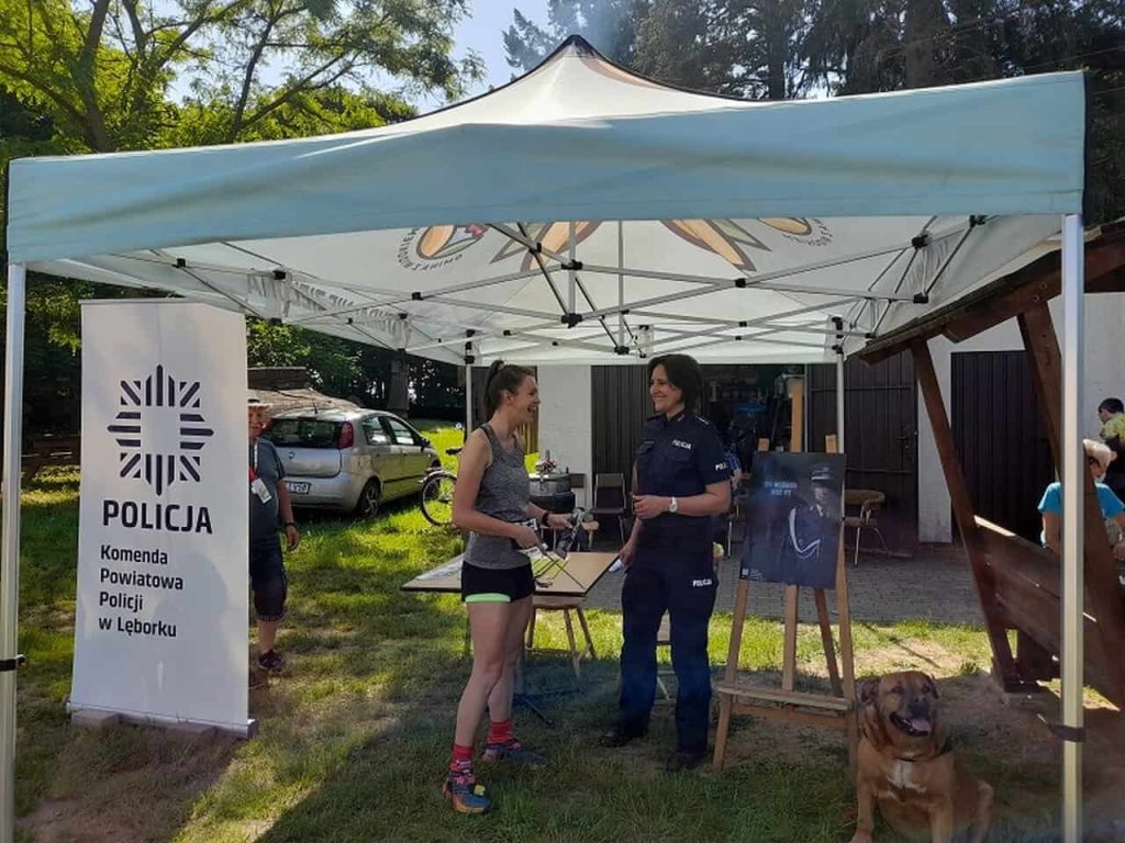 policyjne stoiska. Mundurowi promowali swój zawód w Obliwicach w gminie Nowa Wieś Lęborska podczas odbywających się tam zawodów nordic walking i wzięli udział w pikniku charytatywnym, zorganizowanym na placu Pokoju w Lęborku w celu zebrania środków finansowych na leczenie ciężko chorej dziewczynki. Policyjnego stoiska nie zabrakło też w Lubowidzu, gdzie odbywał się festyn rodzinny. W Obliwicach policjanci kibicowali przy okazji koleżance z pracy, miłośniczce sportu nordic walking, która obchodziła tego dnia swój benefis. Jako jedyna uczestniczyła we wszystkich zawodach organizowanych przez GOK w Nowej Wsi Lęborskiej w latach 2013 – 2024, a odbyło się ich 100.