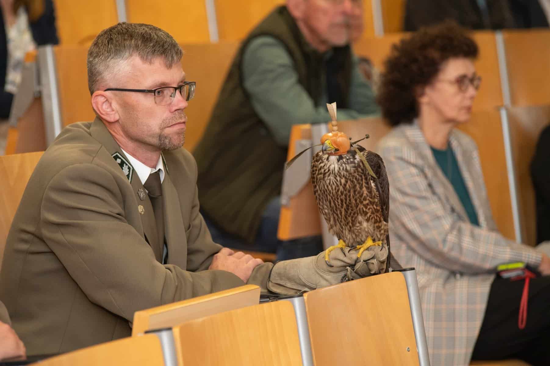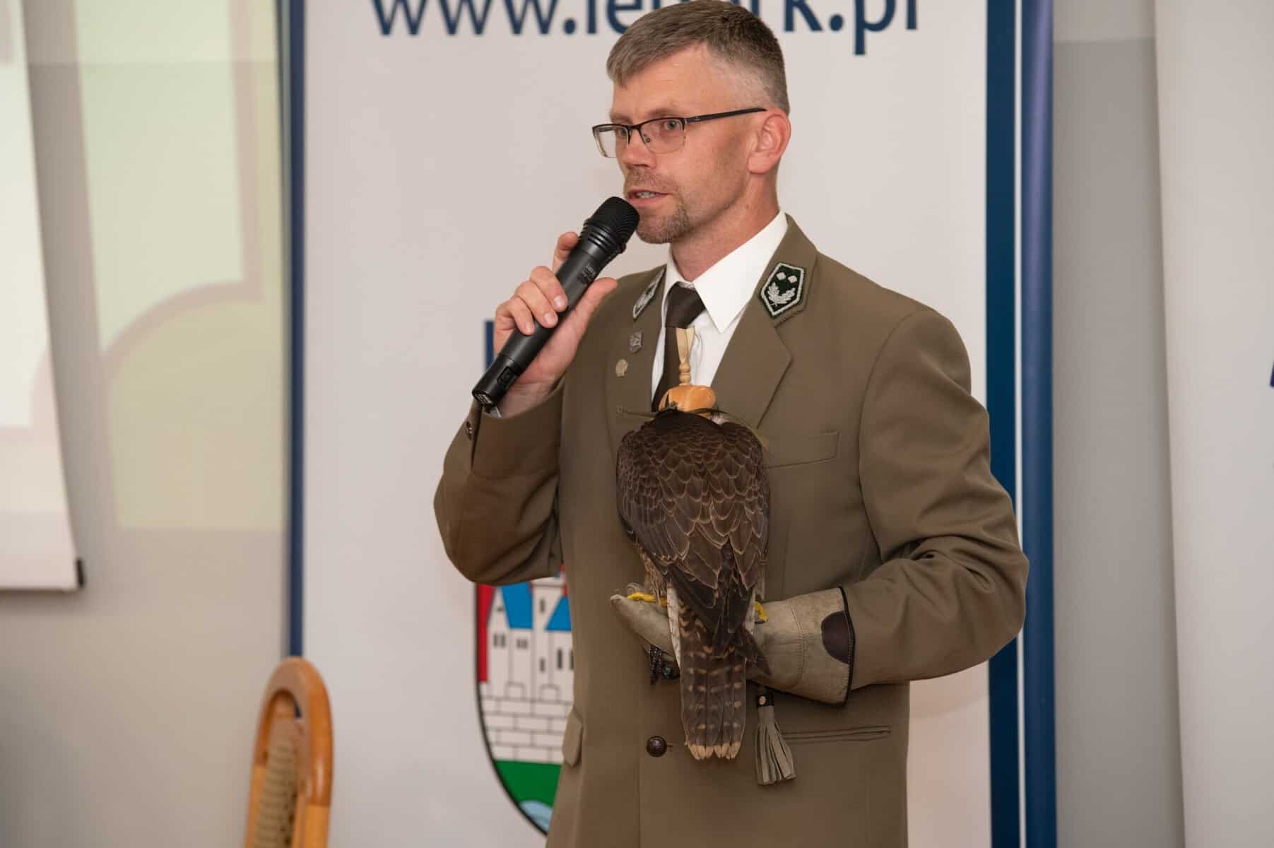 Wśród leśnych akcentów znalazło się również spotkanie z sokolnikiem z Nadleśnictwa Lębork, który zaprezentował możliwości samiczki sokoła wędrownego.