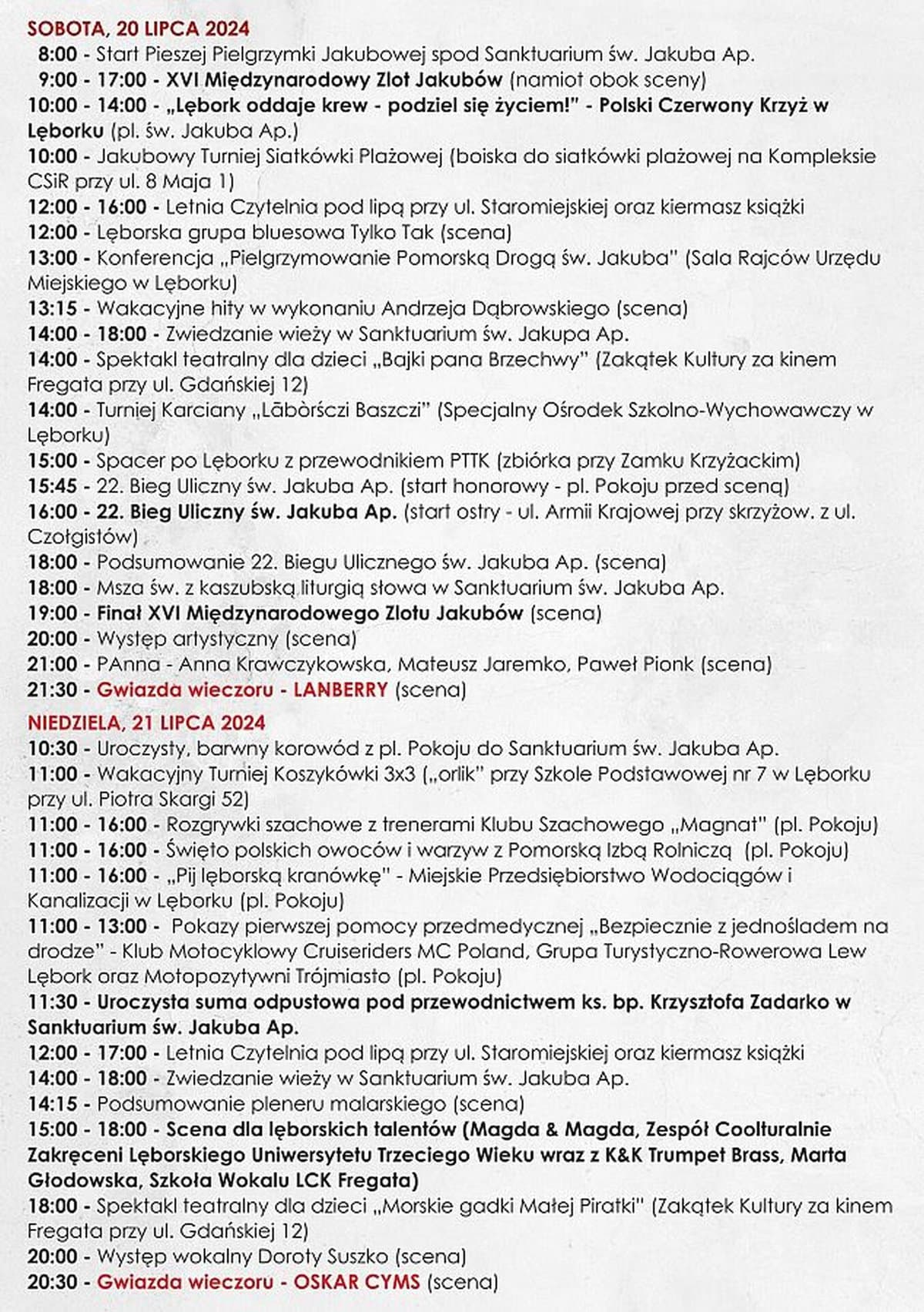 Niezmiennie popularnym wydarzeniem wśród uczestników o imieniu Jakub jest Międzynarodowy Zlot Jakubów, który jak co roku odbędzie się w sobotę, 20 lipca. Również w tę sobotę odbędzie się XXII Bieg Uliczny św. Jakuba na dystansie 10 km. W poprzednich latach ulicami Lęborka biegło kilkuset zawodników.