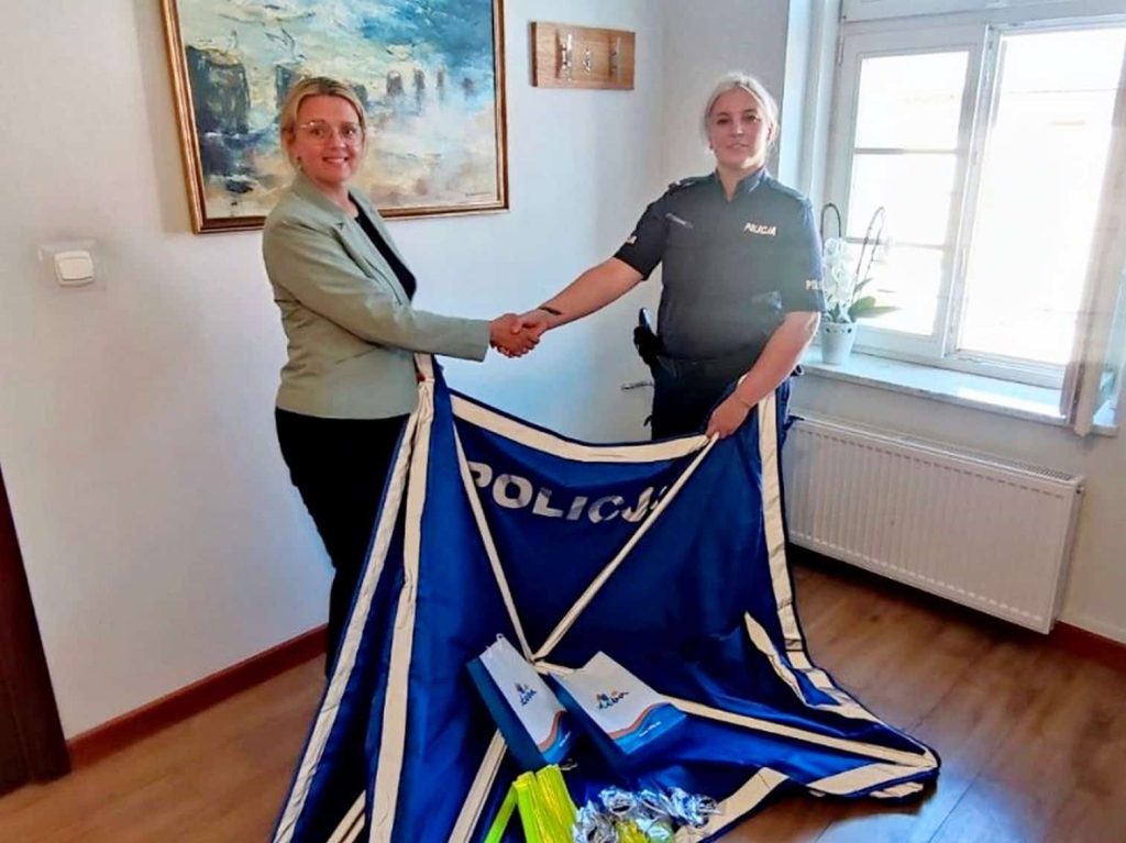 Na wyposażeniu łebskich policjantów pojawił się nowy sprzęt, a wszystko za sprawą dobrej współpracy mundurowych z władzami samorządowymi. Wczoraj z rąk burmistrza Łeby Agnieszki Derby dzielnicowa z Komisariatu Policji w Łebie st. sierż. Agnieszka Bednarek odebrała nowy parawan oględzinowy, niezbędny przy zabezpieczaniu miejsc przestępstw i tragicznych zdarzeń drogowych. Parawany oględzinowe służą do wyizolowania miejsca zdarzenia, skutecznie zapobiegają ingerencji osób trzecich, pomagają również w niekorzystnych warunkach pogodowych zabezpieczyć potencjalny materiał dowodowy.