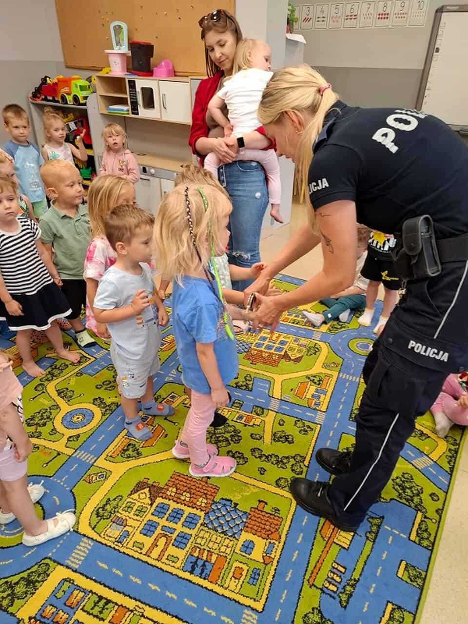 Przy okazji policjantka zajmująca się profilaktyką społeczną przekazała przedszkolakom opaski ledowe, które pomogą zwiększyć ich widoczność na drodze.